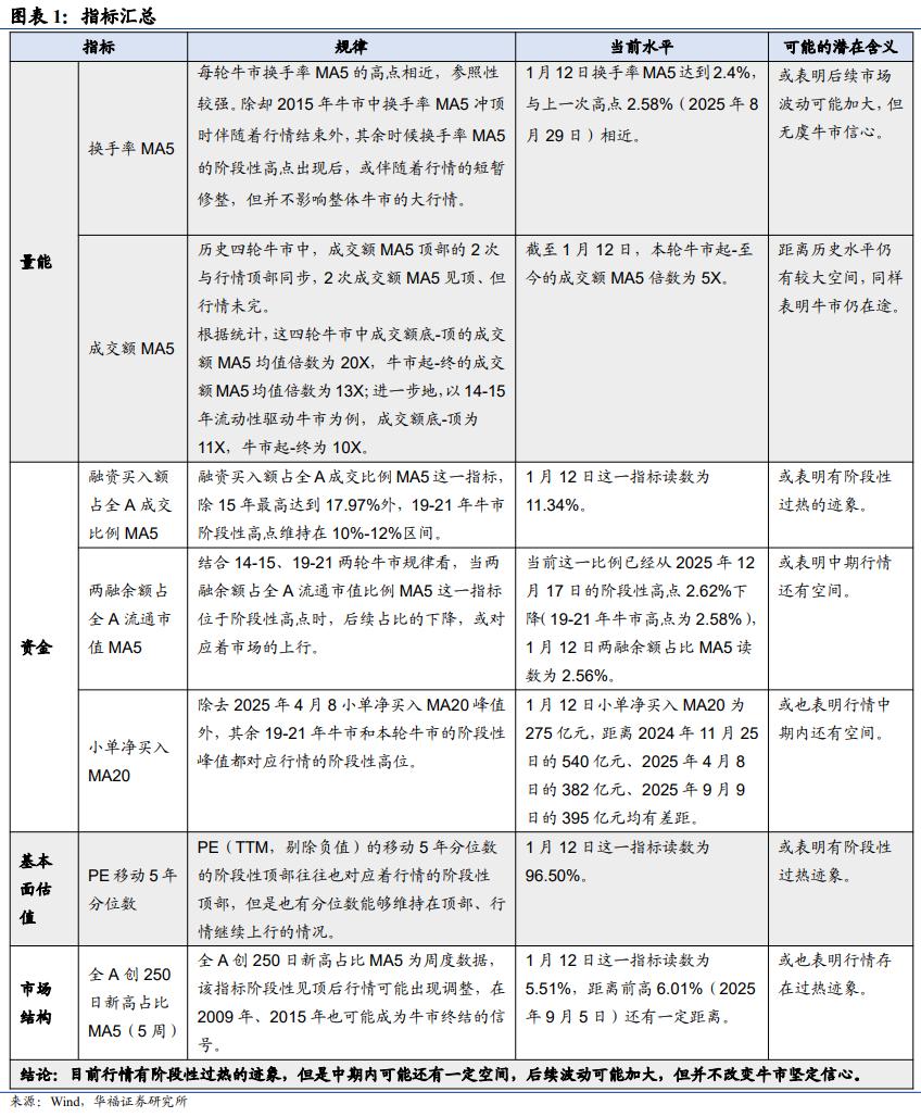 市场多热了? 经历了市场前期一波快速上涨后,大家一定非常关心市场是否过热,以及未来空间有多少。 恰好华福证券于1月13日发布了一篇研究报告,用7个指标,定位了17连阳后(数据截至1月12日)的市场热度。 我把报告的主要结论及各项指标汇总分享给大家。一方面帮助大家了解当下的市场情况,另一方面机构的总结很好,帮助大家如何通过一些定量指标去判断市场的位置。