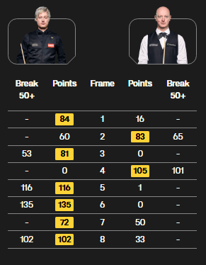 值得一提的是,上半场比赛,双方打成2-2平。休息回来,罗伯逊打出四连鞭,至此大师赛首轮全部八场比赛比分都是6-2。