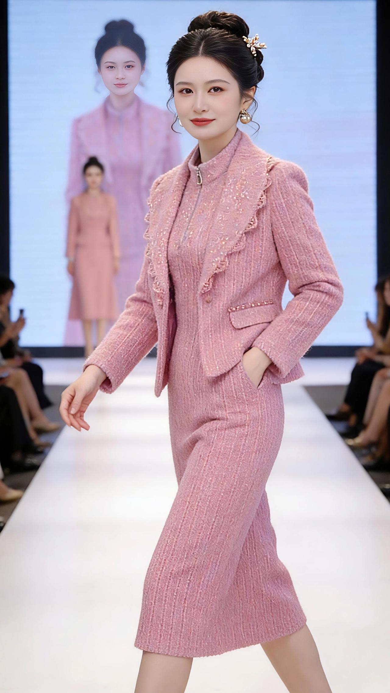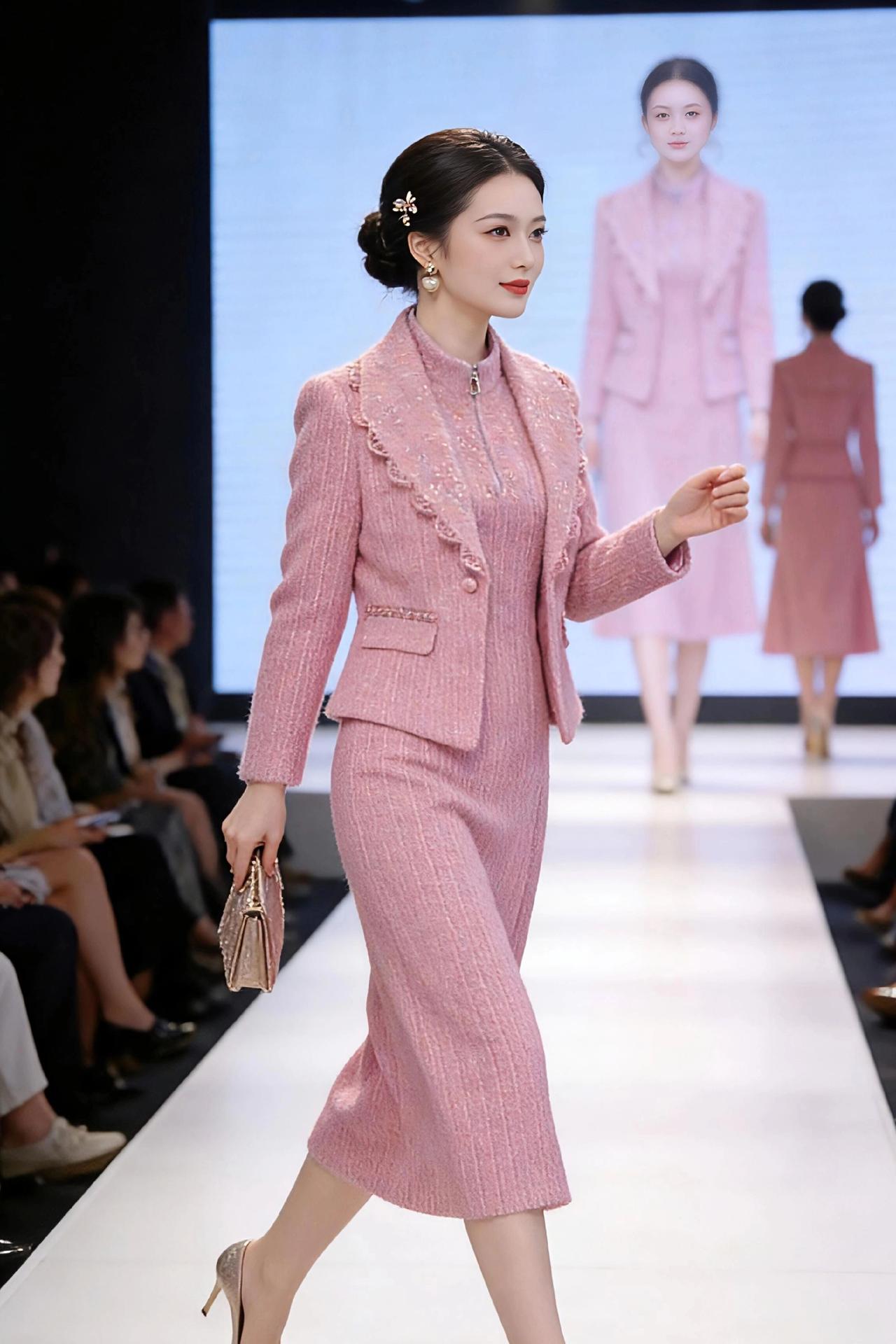 粉纱织就的秀场诗篇 T台的光像揉碎的星子,落在那袭烟粉色的粗花呢套裙上,便漾开了温柔的涟漪。模特踩着细高跟的步履,是时光捻出的轻丝,一步一摇,将面料的肌理与珠光的细碎闪熠,都揉进了秀场的风里。 立领的弧度收着东方的温婉,荷叶边的褶皱又藏了法式的浪漫,烟粉的色调像春日揉过樱花的云,不艳不俗,只在灯光下晕出朦胧的甜。外套的线条利落如裁,却被粗花呢的软柔中和了棱角,下裙垂坠的纹路顺着步履摇曳,似将江南的水纹织进了衣摆。 她抬手时,指尖捏着鎏金的手包,是繁华的注脚;叉腰时,肩线舒展如蝶翼,是自信的模样;垂手而立时,十指轻扣,又化作一朵静静开在T台的粉蔷薇。背景的大屏映着同款的粉,与台下的影影绰绰相映,倒让这抹粉成了秀场里最鲜活的笔触,既写就了时装的精致,也勾勒出东方女性的柔与刚。 当她转身,裙摆扫过纯白的T台,像粉色的浪吻过沙滩,那些藏在针脚里的匠心,那些融在色彩里的情愫,都在这一瞬,成了秀场之上,最动人的诗行。高级感穿搭 新年穿搭 冬季穿搭 时尚套装
