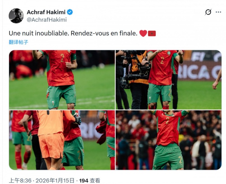 阿什拉夫社媒庆祝晋级非洲杯决赛:难忘的一夜,决赛见!
