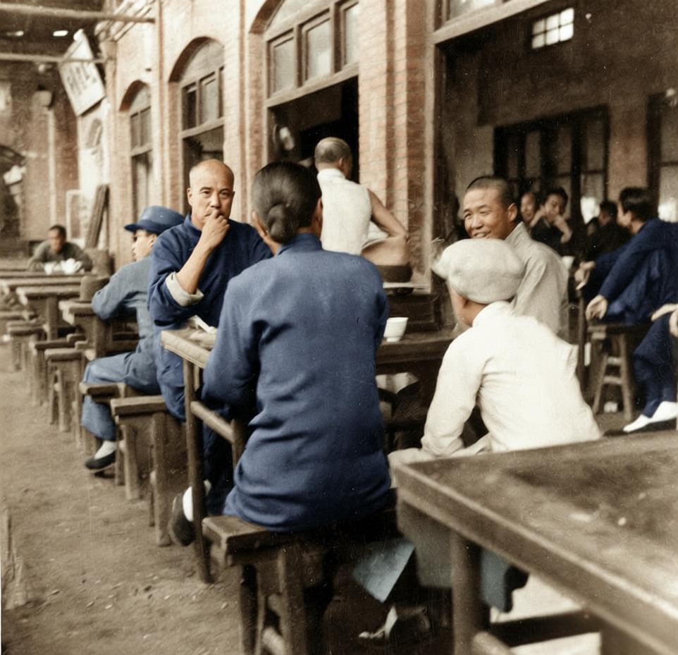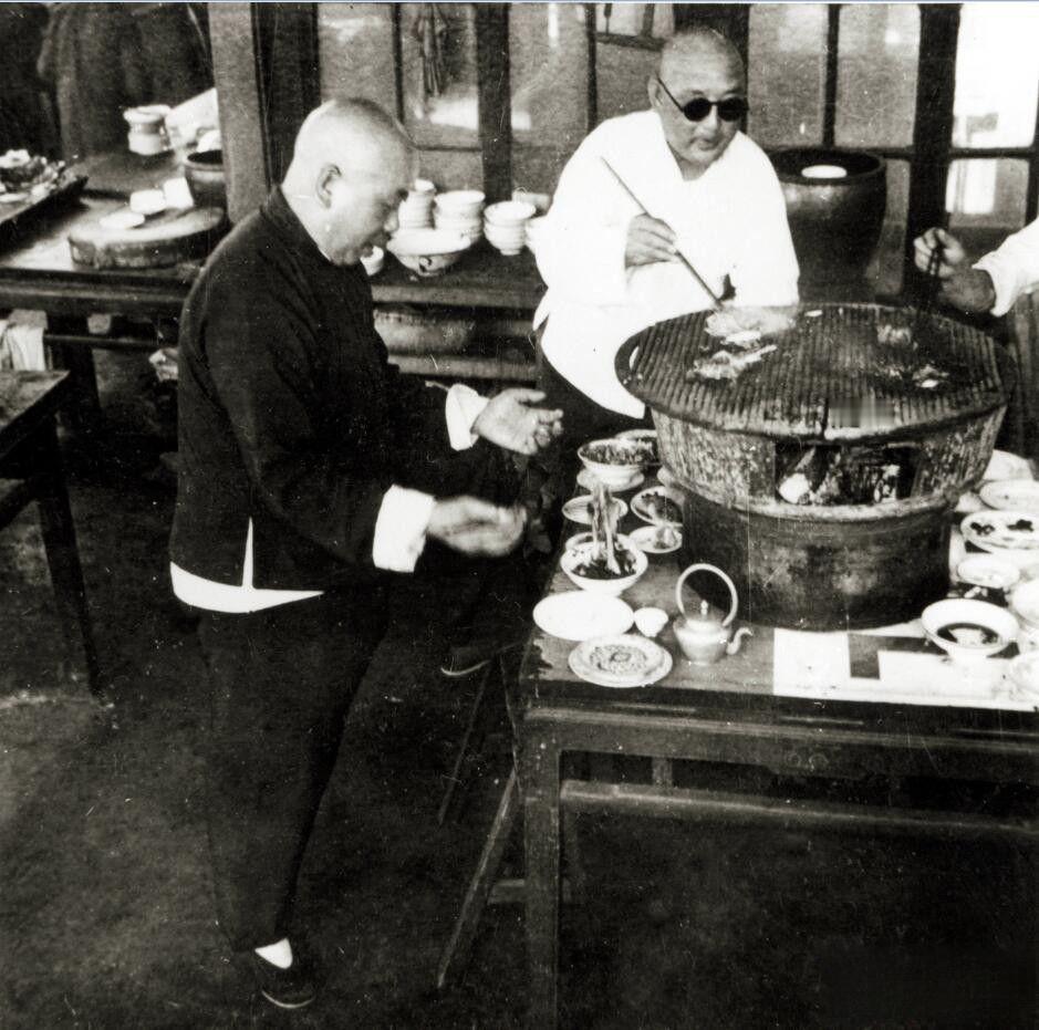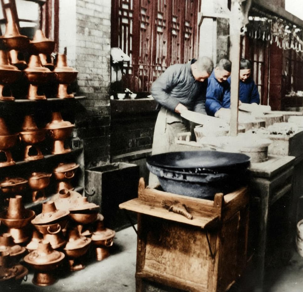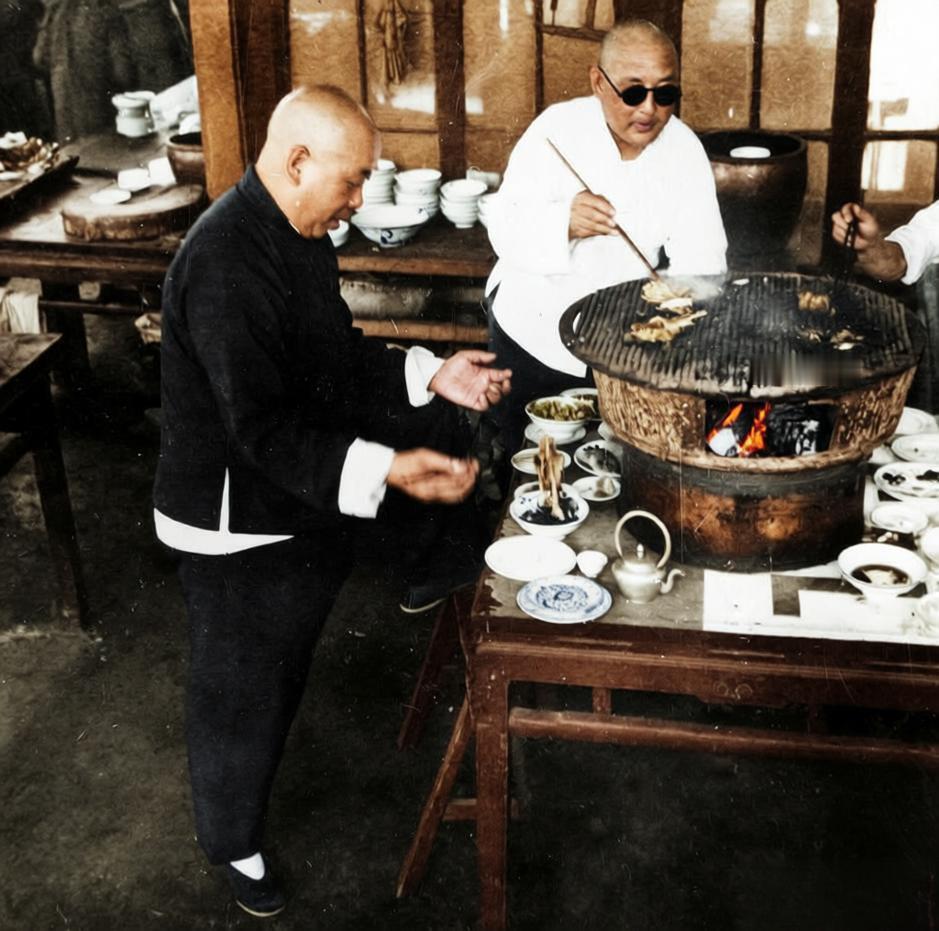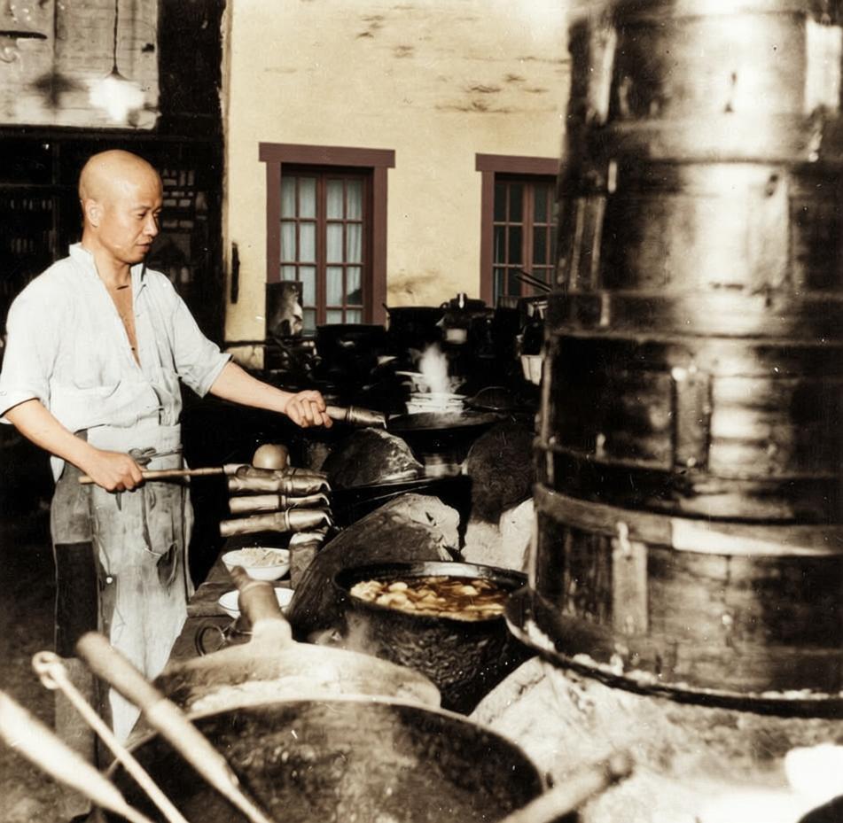 这组老照片摄于民国时期的北京,真实捕捉了老字号饭馆的后厨与堂食日常,充满浓郁的老北京烟火气。 第一张照片聚焦大灶台与炭火,多口铜锅、铁锅、蒸笼层层叠放,旁边满是闪亮的铜制器皿。两位师傅弯腰操作大锅,一人持铲翻炒或出锅,热气腾腾、烟雾缭绕。这是老北京胡同深巷饭馆后厨——炭火熊熊、锅铲叮当,师傅们汗流浃背却井然有序,展现了手工传承的匠心。 第二张照片是两位胖师傅(其中一位戴墨镜,颇有范儿)围着一口大铁炙子,圆形铁盘,下烧松柴炭火,肉片滋滋作响,油光发亮。旁边小料碗堆积如山,师傅手持长筷翻烤,表情专注而享受。这正是烤肉宛场景。炙子烤肉讲究火候、翻转均匀,羊肉或牛肉片薄而嫩,配以葱丝、香菜、芝麻酱,香气四溢。 第三张照片中,长条木桌一字排开,顾客围坐吃喝,食客或低头品尝,或高声谈笑,碗筷碰撞声仿佛穿越时空——这不是高档酒楼,而是平民百姓的日常去处,一盘烤肉、一壶热酒,就能慰藉一整天的劳累。 第四张照片中师傅操作大铁锅,蒸笼高耸。炭火映红脸庞,师傅袖子卷起、手持锅铲,动作娴熟利落。这张照片最能体现老北京清真菜的火候讲究与手工精细,从选肉、切片到上火,一环扣一环,全凭老师傅的一双眼、一双手。