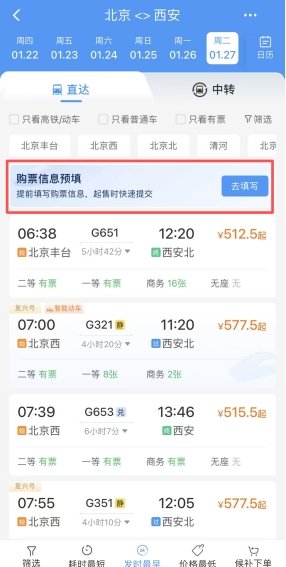 购买北京、天津、上海、江苏、浙江、广东等城市往返四川、重庆等各地车站始发终到列车的长途区段车票,可以进入“购票信息预填”,提前填好乘车人、车次等信息,起售时间一到,立马一键提交,多个车次同时开抢,更方便快捷。小伙伴们可以登录app查看自己城市的车站是否支持。