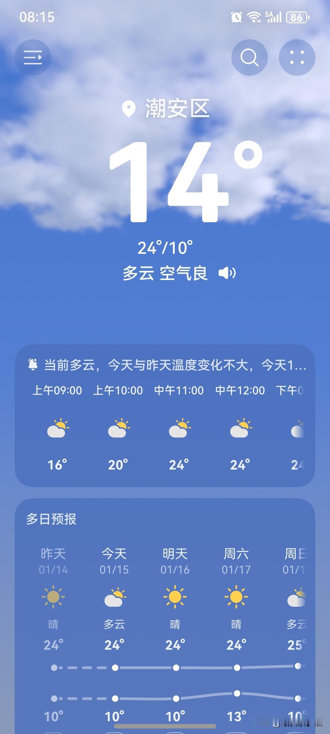 三九天多地最高气温将达20℃,大部地区气温将在波动中回升,与常年同期相比明显偏暖,长江沿线最高气温有望冲击20℃,将在“三九”期间体验春日般的温暖。网友纷纷表示疑惑:三九天回暖可以确定暖冬吗? 广东牌烘干机持续发力!未来三天,广东南部沿海市县云量逐渐增多,部分市县偶有零星小雨,其余大部市县晴间多云,全省大部市县气温逐渐回升,昼夜温差较大,西江流域、珠三角南部沿海和粤西市县早晚有(轻)雾。 今天(15日),潮州喜提一个多云天气,气温10~24℃,此刻气温14℃,体感温度11℃。 一起来看看今天的天空吧!今天的天气画风与昨天不一样了,晴天转多云。 昨天夜里居然下了雨,而且还挺大的,睡到迷迷糊糊的,也不知道是几点,隐隐约约能听到雨声…… 早上起来发现地面湿透了,看来昨晚的雨是下到位了。 虽然下雨了,气温却没有下降,依然是一片暖洋洋! 今天的天气从整体来讲,还是不错的,值得拥有一个好评!唯一美中不足的是没有阳光。 如此天气!元芳,你怎么看? [我想静静][捂脸][机智][笑哭][我想静静][大笑][捂脸][捂脸]