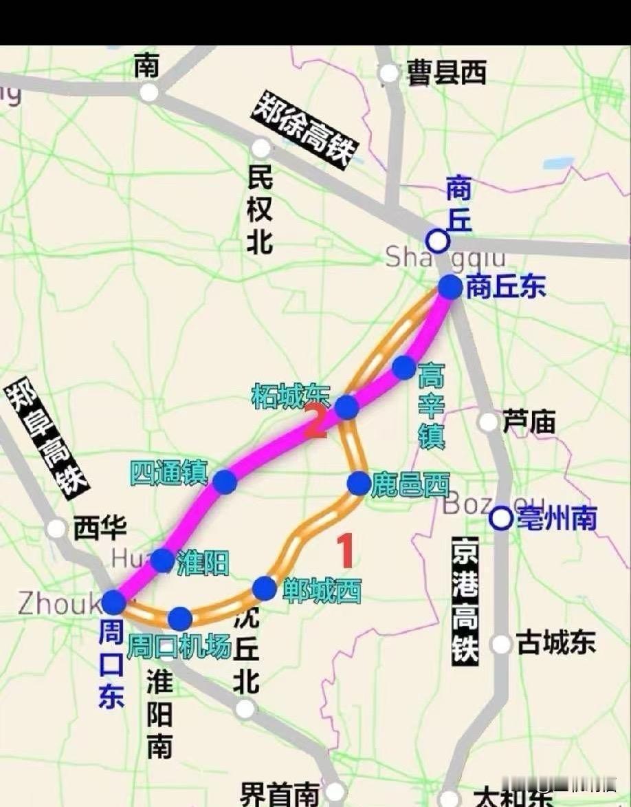 周商高铁规划有两套方案,这可真是商丘和周口的一场博弈。 商丘的西线方案,列车从市区站发车,途经柘城,直切淮阳四通镇到周口西。路短花钱少,时速三百出头,半小时就能从商丘到周口。而且商丘东站配套好,能容纳更多车次。拉上淮阳也有道理,人多还有景区,能带动旅游。 周口的东线方案,柘城之后向东,先进鹿邑、郸城,绕过淮阳。另外规划里推荐路线从周口东出发,经周口机场、郸城西等地到商丘东,体现河南打造高铁“外环路网”思路。 选哪个还挺难的,西线重效率,东线更重全面覆盖,就看最后谁能说服谁啦。