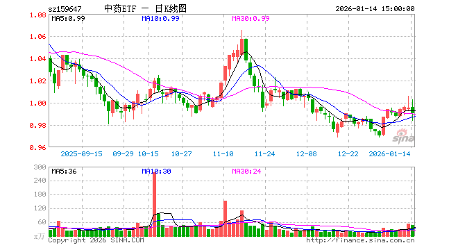 1月14日,中药ETF(159647)跌0.50%,成交额4555.78万元。当日份额增加100.00万份,最新份额为14.29亿份,近20个交易日份额减少50.00万份。最新资产净值计算值为14.14亿元。