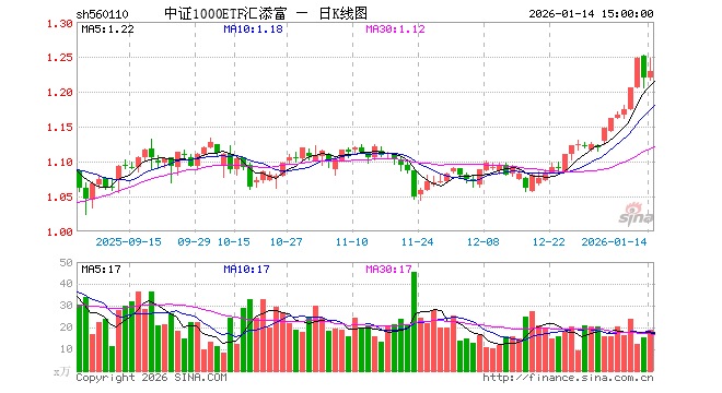 1月14日,中证1000ETF汇添富(560110)涨0.74%,成交额2324.22万元。当日份额增加300.00万份,最新份额为1.58亿份,近20个交易日份额减少300.00万份。最新资产净值计算值为1.93亿元。