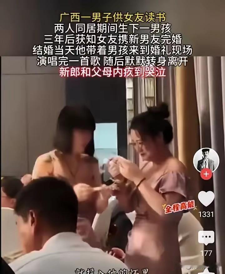 广西一男子供女友读书,同居期间生下一个男孩。三年以后,女友和新男友结婚,当天男子带着孩子,来到婚礼现场唱了一首歌,带着孩子默默离开。 阿强是广西农村出来的,在工地当小工,赚的全是血汗钱。当年阿琳考上大专,家里凑不齐学费,阿强想都没想,直接把准备盖新房娶她的钱拿了出来,说:“你去读,我养你。” 阿琳上学这三年,阿强在工地扛水泥、搬砖头,每个月工资发下来,除了留够自己吃饭的钱,剩下的全转给了她。两人在学校附近租了个十来平米的单间,第二年阿琳意外怀孕,阿强还是那句话:“生下来,我养。”儿子小宇出生后,他白天在工地晒得脱皮,晚上回来就抱着孩子哄睡,就为了让阿琳能安心上课。 阿琳毕业那天,阿强特意买了件新衬衫,拎着她最爱吃的芒果去接她,以为好日子要来了。结果阿琳只淡淡地说:“我们不是一个世界的人了。”没过俩月,阿强就收到了她的婚礼请帖,新郎是县城里的公务员,家里开着建材店,条件比他好太多。 婚礼在县城最好的酒店办,阿强牵着小宇站在门口,没人拦他。司仪刚喊完“有请新人入场”,阿强直接走上台,拿起话筒说:“各位,我给大家唱首《别怕我伤心》吧。” 他声音沙哑,唱到“你和他之间,是否已经有了真感情”时,阿琳的脸瞬间白了,新郎想拉她下台,却被自己爸妈拽住了。小宇拽着阿强的衣角,奶声奶气地问:“爸爸,妈妈怎么不看我们?” 唱完最后一句,阿强把话筒一放,牵着小宇转身就走。刚到酒店门口,就听见身后新郎妈哭着喊:“造孽啊,这孩子太实诚了!” 阿强没回头,他知道这一转身,就跟过去彻底两清了。小宇在他怀里问:“爸爸,我们以后还能跟妈妈玩吗?”阿强摸了摸儿子的头说:“等她想我们的时候。” 其实他昨晚想了一夜,不是来闹场的,就是想让阿琳知道,他和小宇,真的在她的青春里存在过。