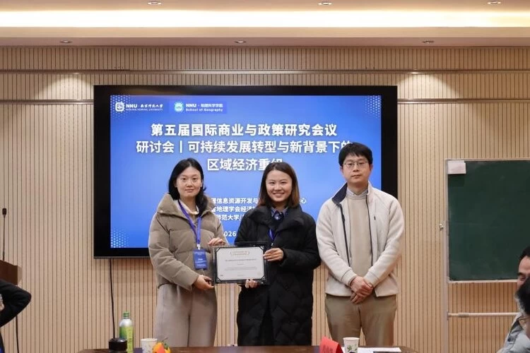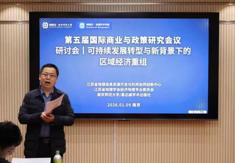 2026年1月9日上午,第五届国际商业与政策研究会议暨可持续发展转型与新背景下的区域经济重组研讨会在南京师范大学仙林校区地理科学学院顺利召开。本次会议由江苏省地理信息资源开发与利用协同创新中心、江苏省地理学会经济地理专业委员会、南京师范大学地理科学学院联合主办,易达威学术出版社合作支持,汇聚了来自南京师范大学、南京大学、中国科学院南京地理科学与湖泊研究所、中共江苏省委党校、南京农业大学及科研机构的14位专家学者与12名研究生,各方围绕相关主题展开学术汇报,共同为可持续发展转型与区域经济重组建言献策。