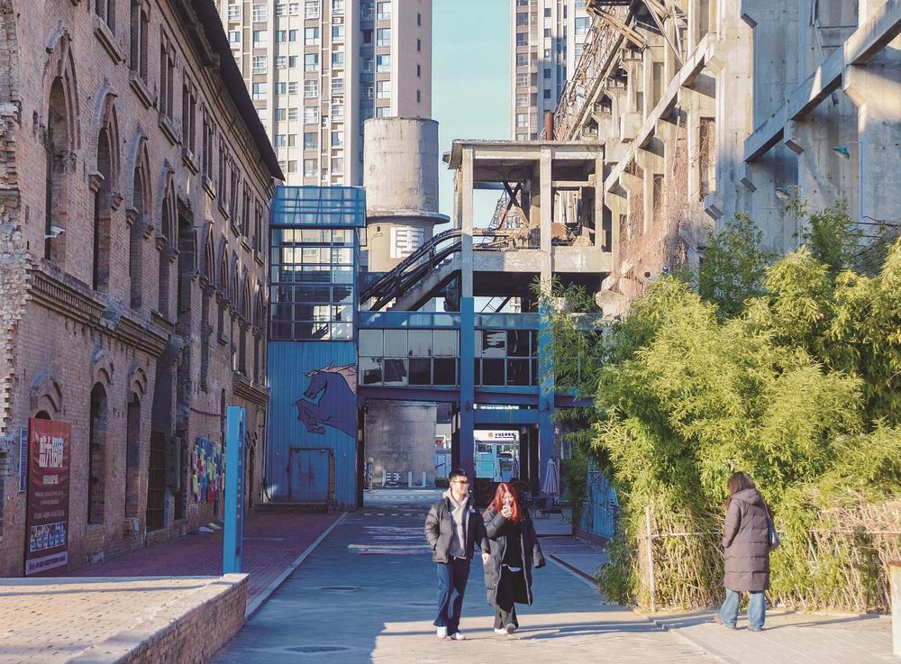 图为游客在暖阳下漫步园区,感受工业文明的厚重,享受冬日别样乐趣。