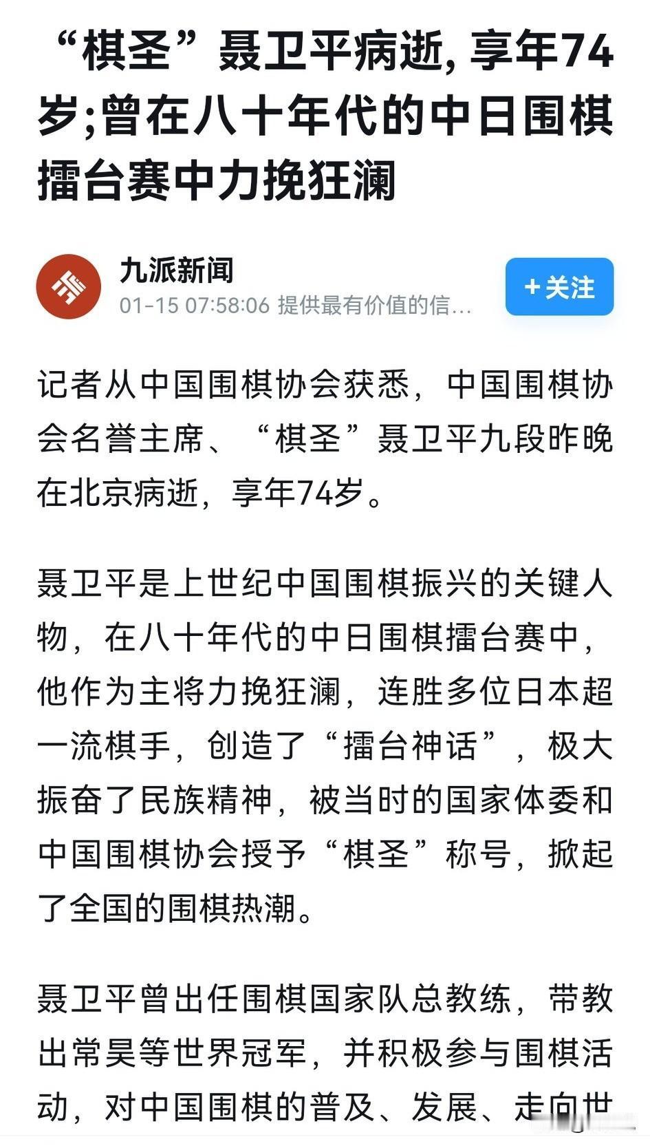 聂卫平昨天夜里快11点走了,74岁,抗癌13年没输,最后栽在突发的病上。