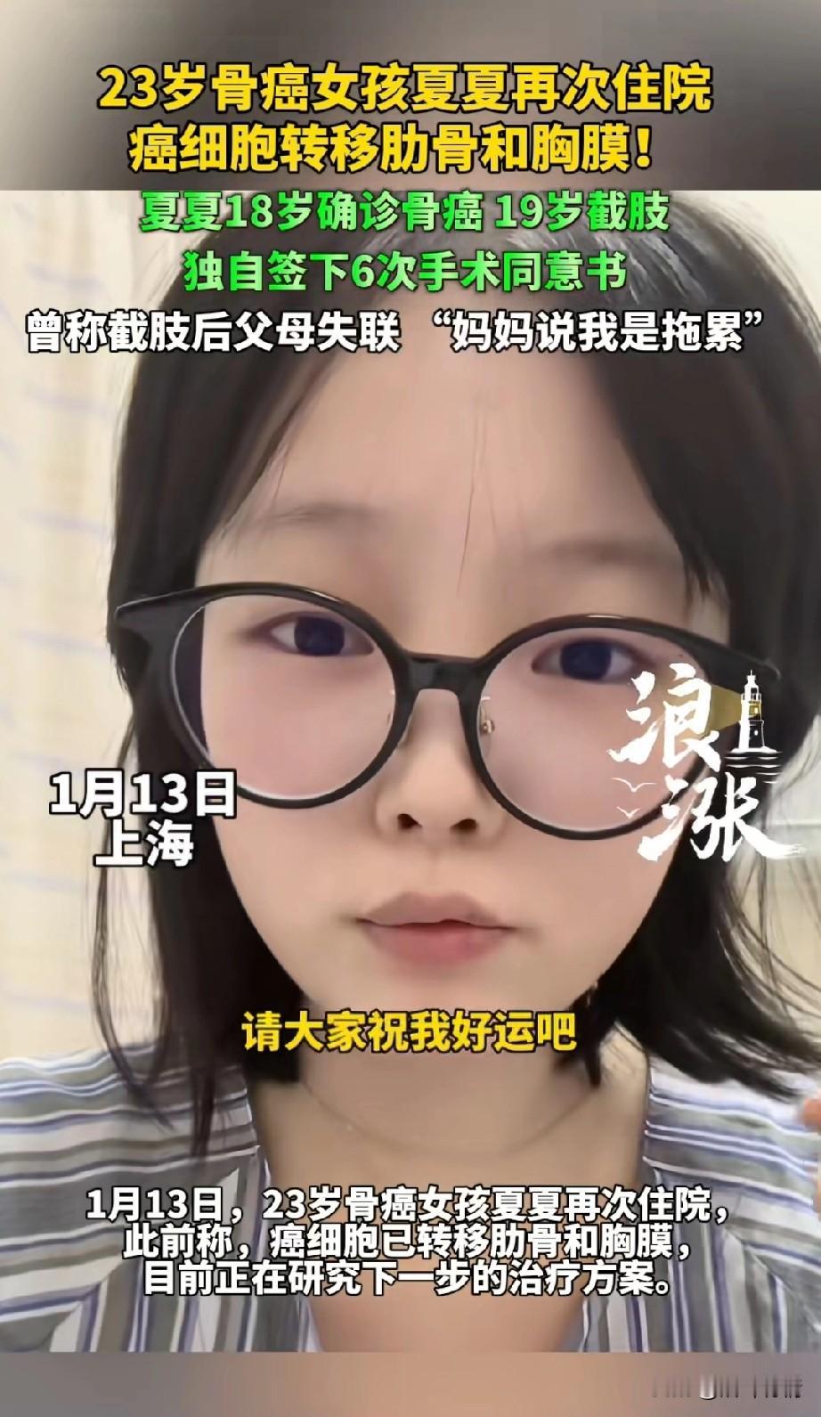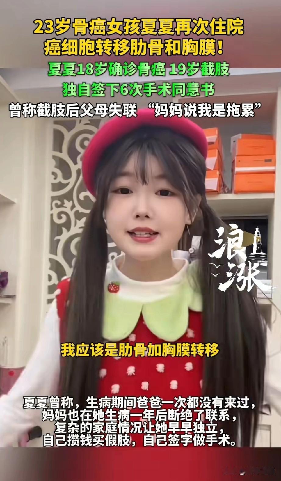 女孩夏夏真的很励志, 她的父母也太狠心了, 她截肢之后父母就失联了, 妈妈曾说她是个累赘, 后来只能直播独自养活自己, 这个女孩命真的太苦, 18岁确诊骨癌, 19岁的时候截肢了, 截肢之后父母就抛下了, 她生病后他的父亲一年都没有看过, 而 她的妈妈更是直接和她断了联系, 复杂的家庭情况让她早早独立, 目前只有头发花白的奶奶陪着她! 她自己攒钱买假肢, 这真的是让人无法想象, 她独自一人签下了6次手术同意书, 如今23岁的她再次住院了, 她表示癌细胞已经转移到了肋骨和胸膜,目前正在研究下一步治疗方案, 她也是再次住院, 独自和病魔做斗争, 不过令她开心的是有很多粉丝关心她, 这也让她多次受到了鼓励, 确是这么一个热爱生活的女生, 不应该这么早就离开, 虽然她在网上直播赚钱, 有时候也会跳一些舞蹈, 这却是她唯一的谋生手段, 她的经历很让人同情, 祝福她能再次健康的出院。 上海 夏夏姐 夏夏自拍 夏夏自媒体