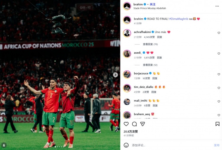 皇马中场布拉欣·迪亚斯在本场比赛首发出战,他也在赛后通过社媒晒出和队长阿什拉夫的合照,并配文:“晋级决赛!”