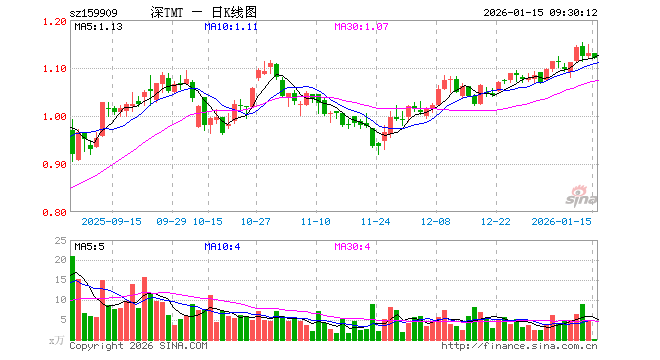 1月15日,TMT50ETF(159909)开盘涨0.00%,报1.130元。TMT50ETF(159909)重仓股方面,中际旭创开盘跌1.65%,新易盛跌0.99%,立讯精密跌0.45%,北方华创跌0.66%,胜宏科技跌1.39%,中兴通讯跌1.09%,京东方A跌1.30%,海康威视跌0.57%,科大讯飞跌1.56%,沪电股份跌0.53%。