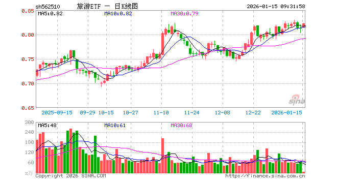 1月15日,旅游ETF(562510)开盘涨0.25%,报0.814元。旅游ETF(562510)重仓股方面,中国中免开盘跌0.38%,上海机场跌0.09%,中国东航跌0.51%,宋城演艺涨0.59%,南方航空涨0.00%,中国国航涨0.35%,华侨城A跌0.39%,锦江酒店涨3.56%,春秋航空涨0.00%,首旅酒店涨3.69%。