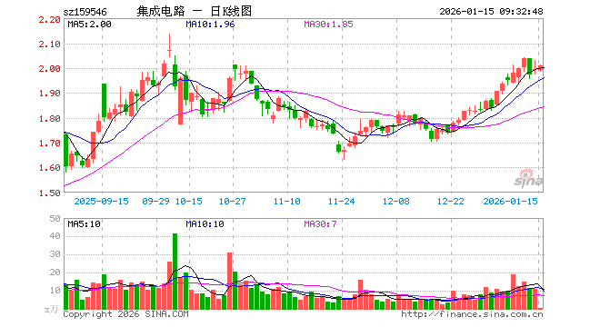 1月15日,集成电路ETF(159546)开盘跌0.25%,报1.990元。集成电路ETF(159546)重仓股方面,中芯国际开盘跌0.80%,寒武纪跌1.26%,海光信息涨0.99%,澜起科技涨0.26%,兆易创新跌1.34%,豪威集团跌0.07%,芯原股份涨0.85%,长电科技跌0.64%,紫光国微涨10.00%,通富微电跌1.00%。