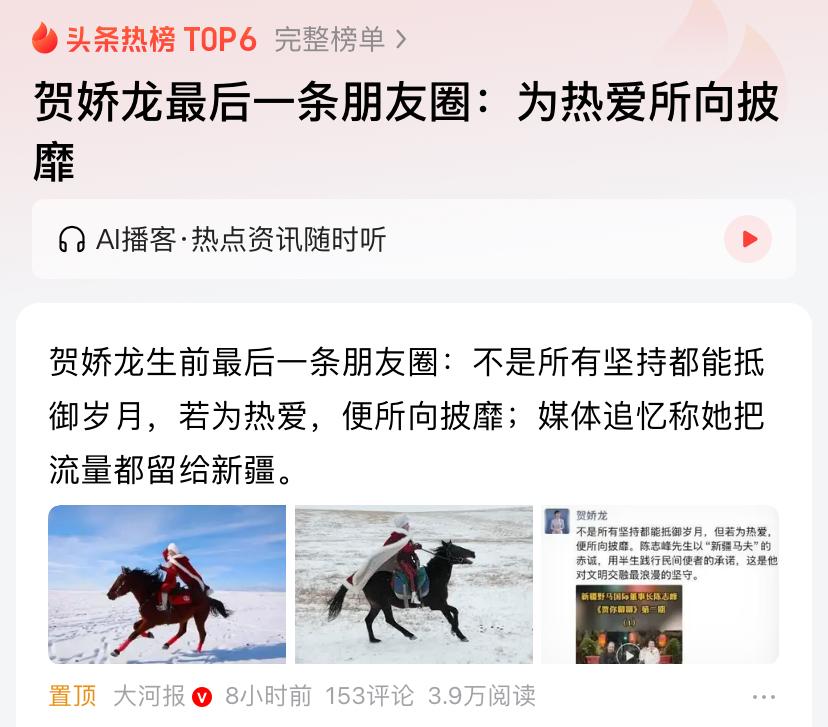 多少人都不愿意相信自己的眼睛、耳朵,但是,“最美副县长/文旅局副局长”贺娇龙还是走了,永远的离开了爱她的、她爱的那个伊犁~ 昨天早上看到她“出事离开”的消息,但官方又辟谣说“还在抢救”,内心深处痛楚的同时,也默默期待“奇迹的发生”。 然而,她还是在1月14日23时永远的离开了。 知道她、熟悉她的人,都知道她有多拼,为了伊犁的旅游及农产品,她不顾自身安危,多次“策马奔腾”,以流量推介当地的一切。让伊犁及整个新疆“销出去”,让大家富起来。 47岁,她以英姿飒爽的靓颖,让全国人民知道了大美新疆、富饶新疆。直至献出了自己年轻的生命。 2026年,第一滴痛楚的泪,应该为她而流。 而她生前最后一条朋友圈“…若为热爱,所向披靡”,则是留给我宝贵的追忆。 她是一个纯粹的共产党员! 她是一个优秀的共产党员! 她是一个真正履行誓言的共产党员! 走好娇龙,我们永远怀念您! 贺娇龙对新疆旅游业的贡献有多大