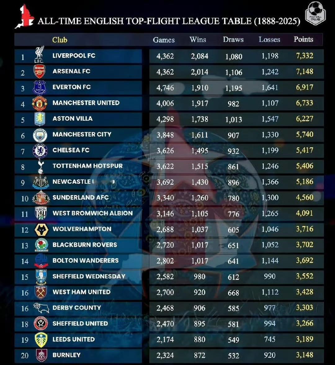 英格兰联赛1888年到2025年总积分榜。 1利物浦,7332分排名历史第一。 2阿森纳,7148分排名历史第二。 3埃弗顿,6917分第三。 4曼联,6733分第四。 5维拉,6227分。 6曼城,5740分。 后面是切尔西,热刺,纽卡斯尔在前十。 曼联只是总历史第四,1992年开始的英超历史第一,真正第一是利物浦,另外阿森纳追得比较近。[大金牙]