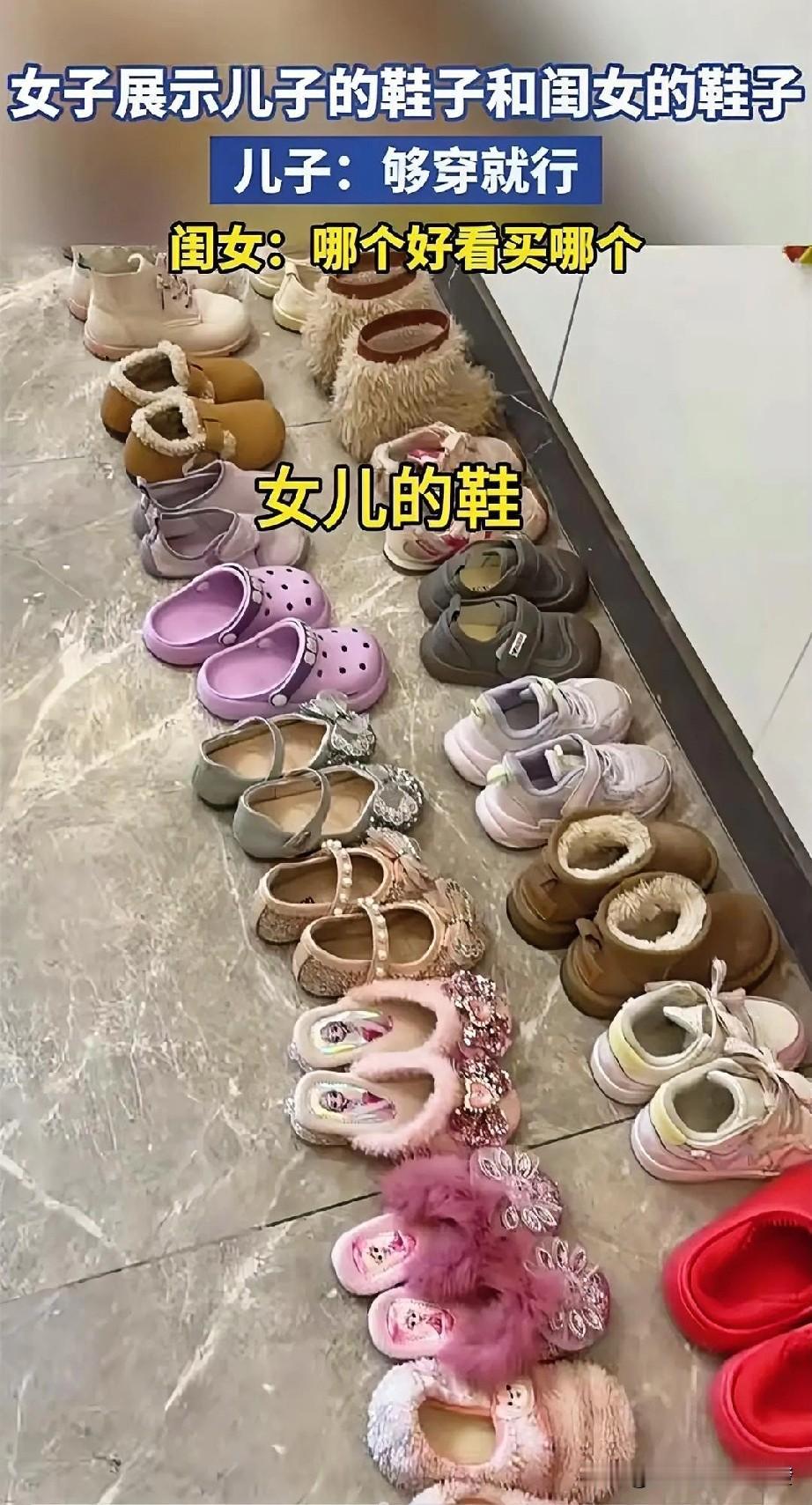 女子看到屋内儿子和女儿所穿鞋的数量对比后,不禁笑了。儿子只有区区3双鞋,而女儿的鞋子足足摆了两排,起码有20双。 不仅如此,儿子的鞋颜色款式单一,而女儿的鞋就不一样了,不管是颜色还是款式,可谓是花样超多。 要不说女孩和男孩不一样呢,从这个穿鞋就可以看出来:男孩追求少而实用,女孩则追求多而好看。 不说别的,就我家那位,柜子里放的鞋加上平时穿的,也不会少于20双,女孩子嘛,天生就爱美,父母都是比较宠的,也很正常。 大家说是吧? 内容来源:云视在线 河南