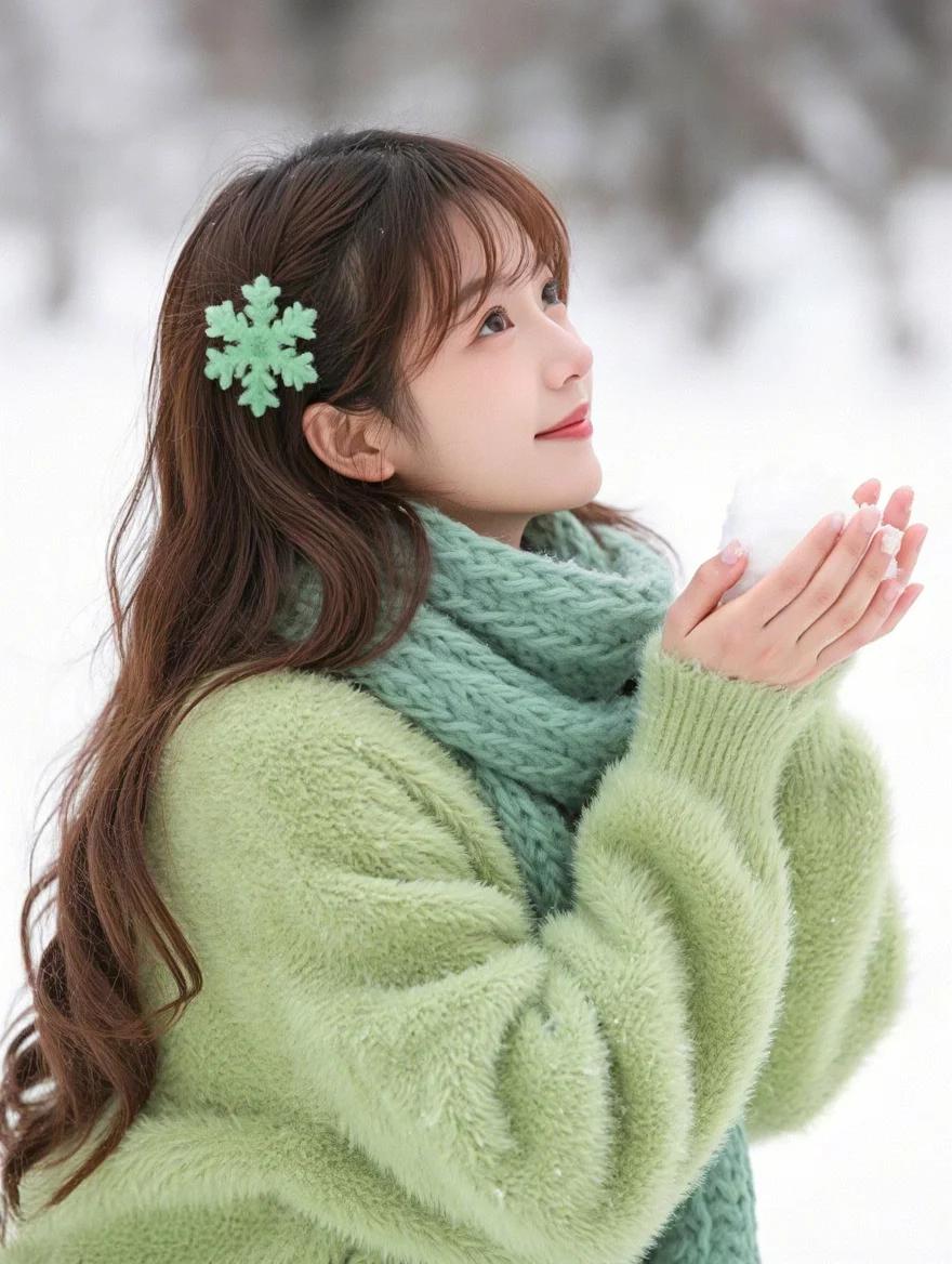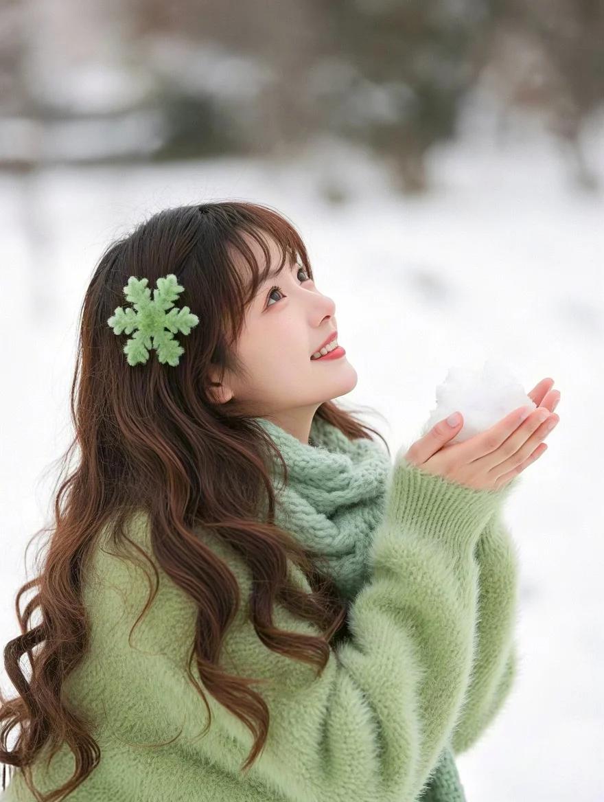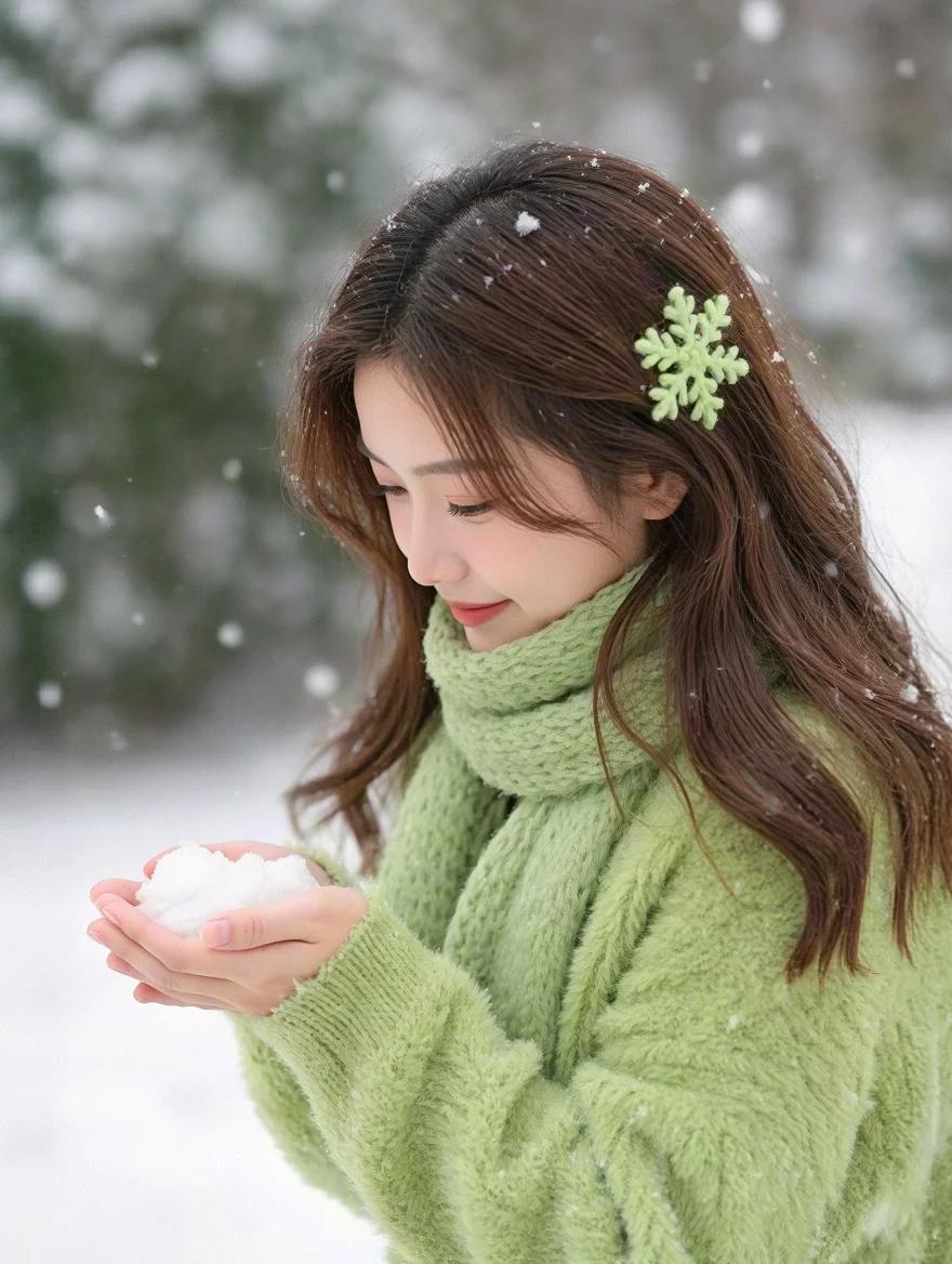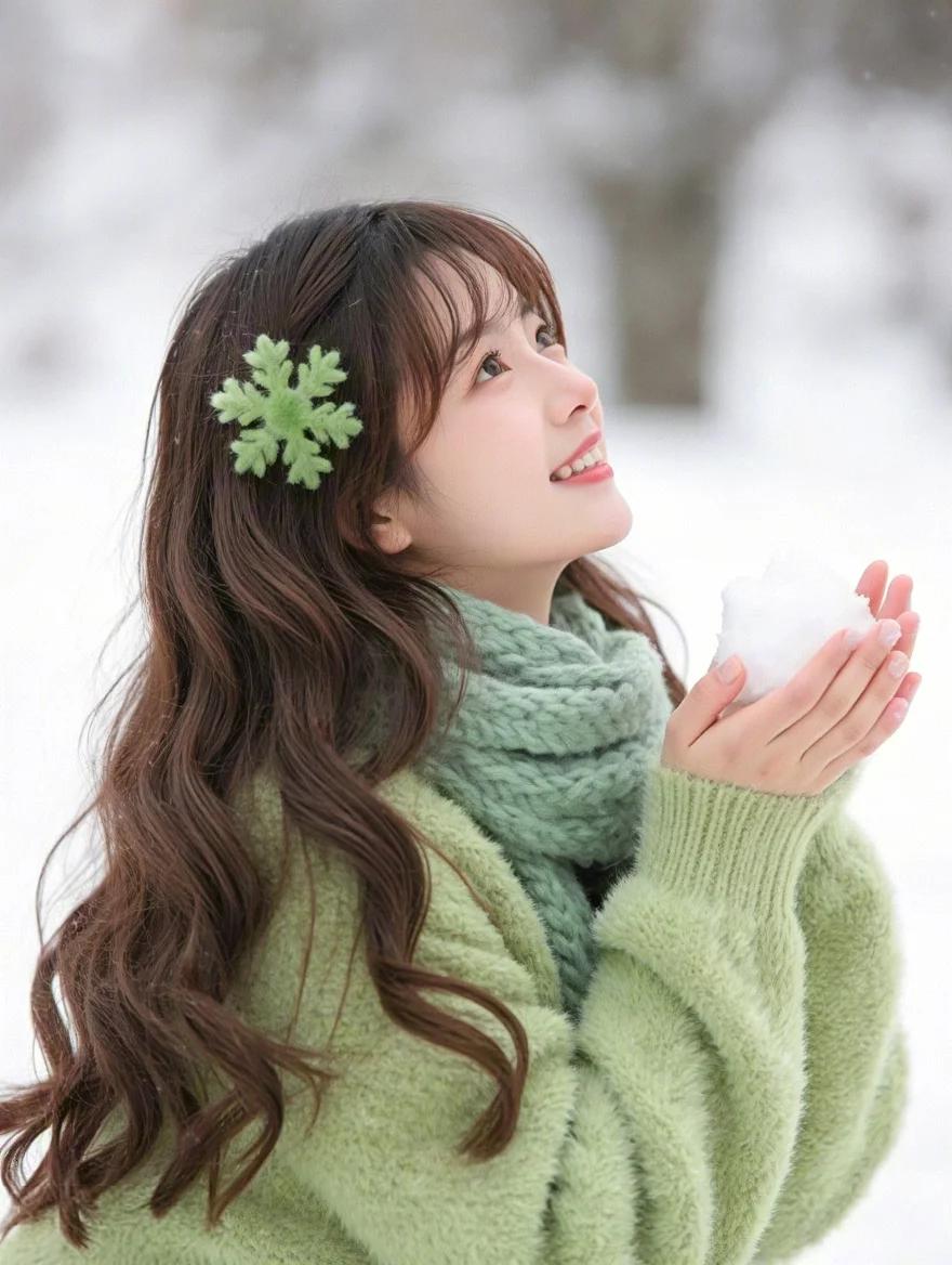 冬日暖阳下少女捧雪球 温柔如画