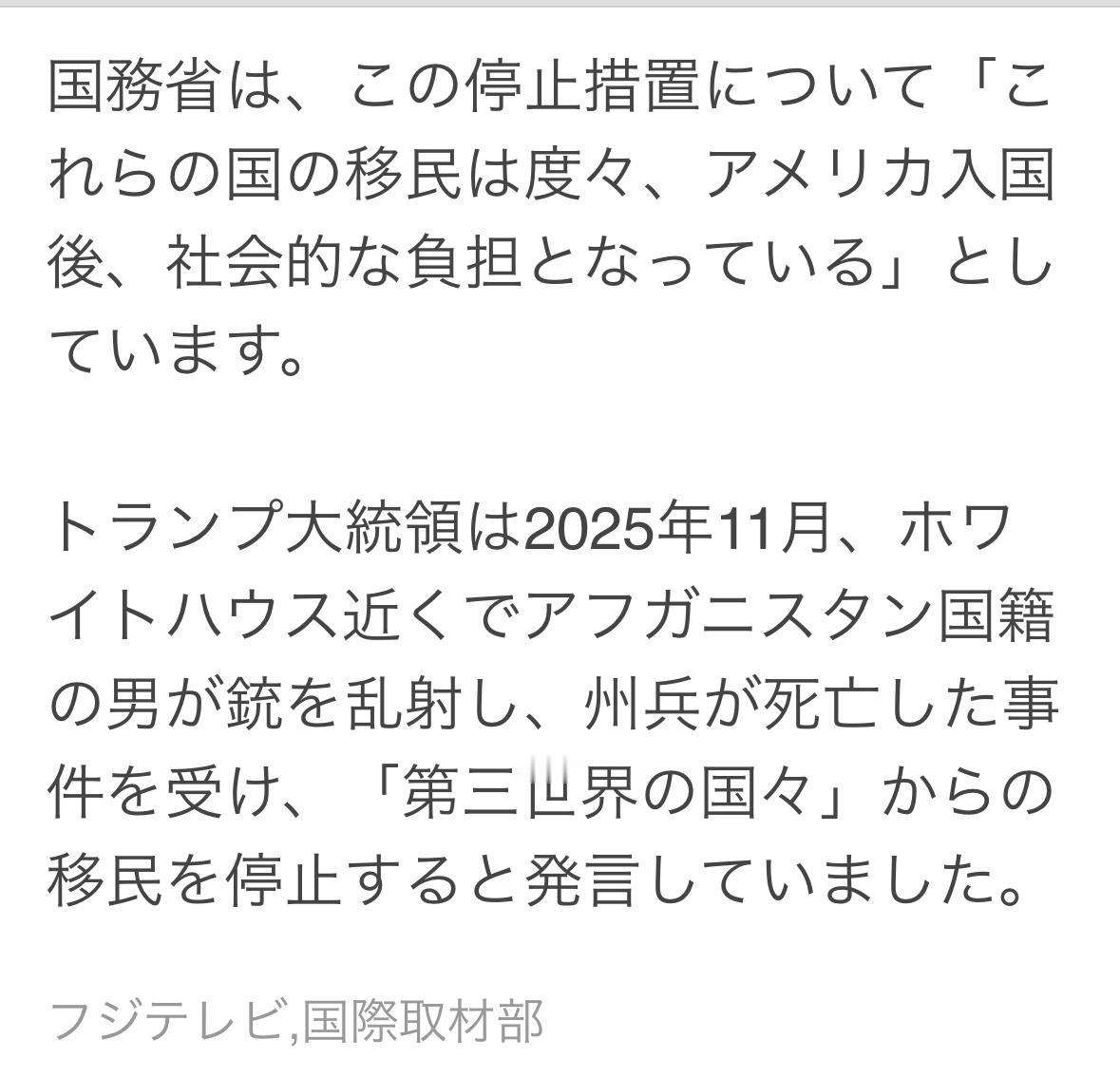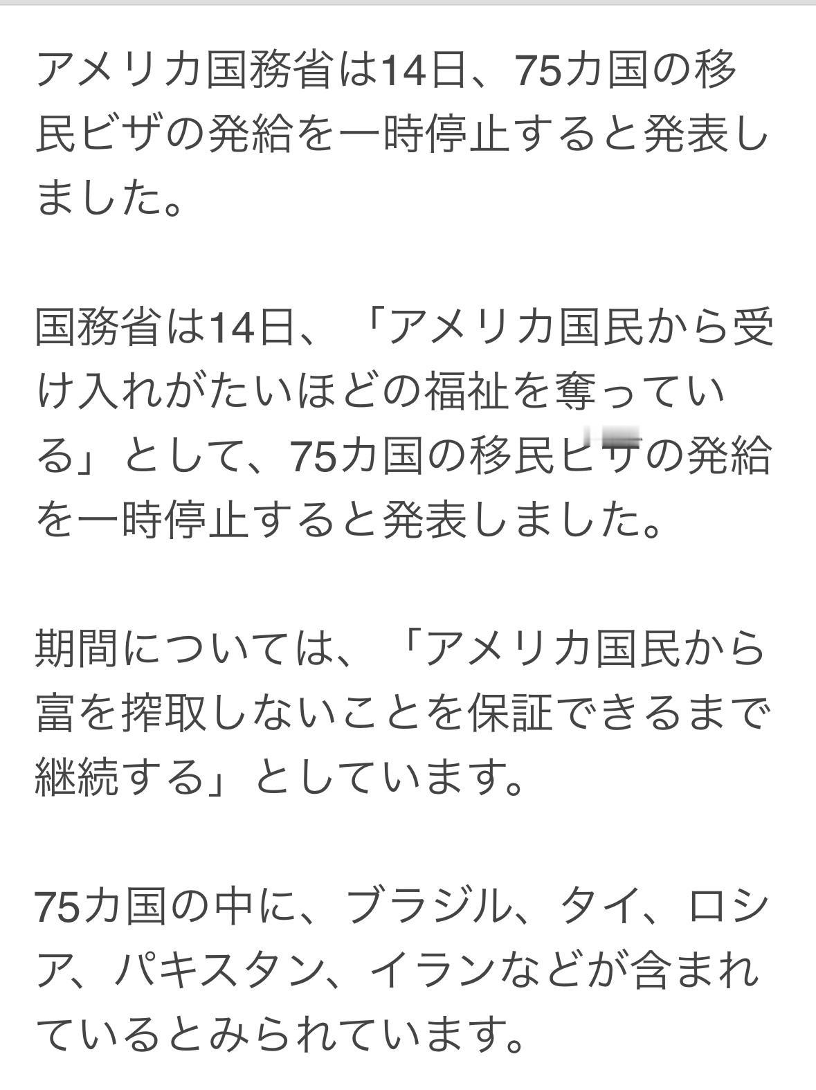 14日美国宣布:1月21日起将暂停向75个国家发放移民签证,理由是这些国家对美国公民福利的剥夺程度令人无法接受,这些国家的移民往往成为社会负担。 暂停发放签证的期限将持续到我们能够确保他们不再从美国人民身上榨取财富为止。 75个国家包括巴西、泰国、俄罗斯、巴基斯坦、伊朗、阿富汗、尼日利亚、也门、索马里、缅甸、老挝、埃及、海地、哥伦比亚。