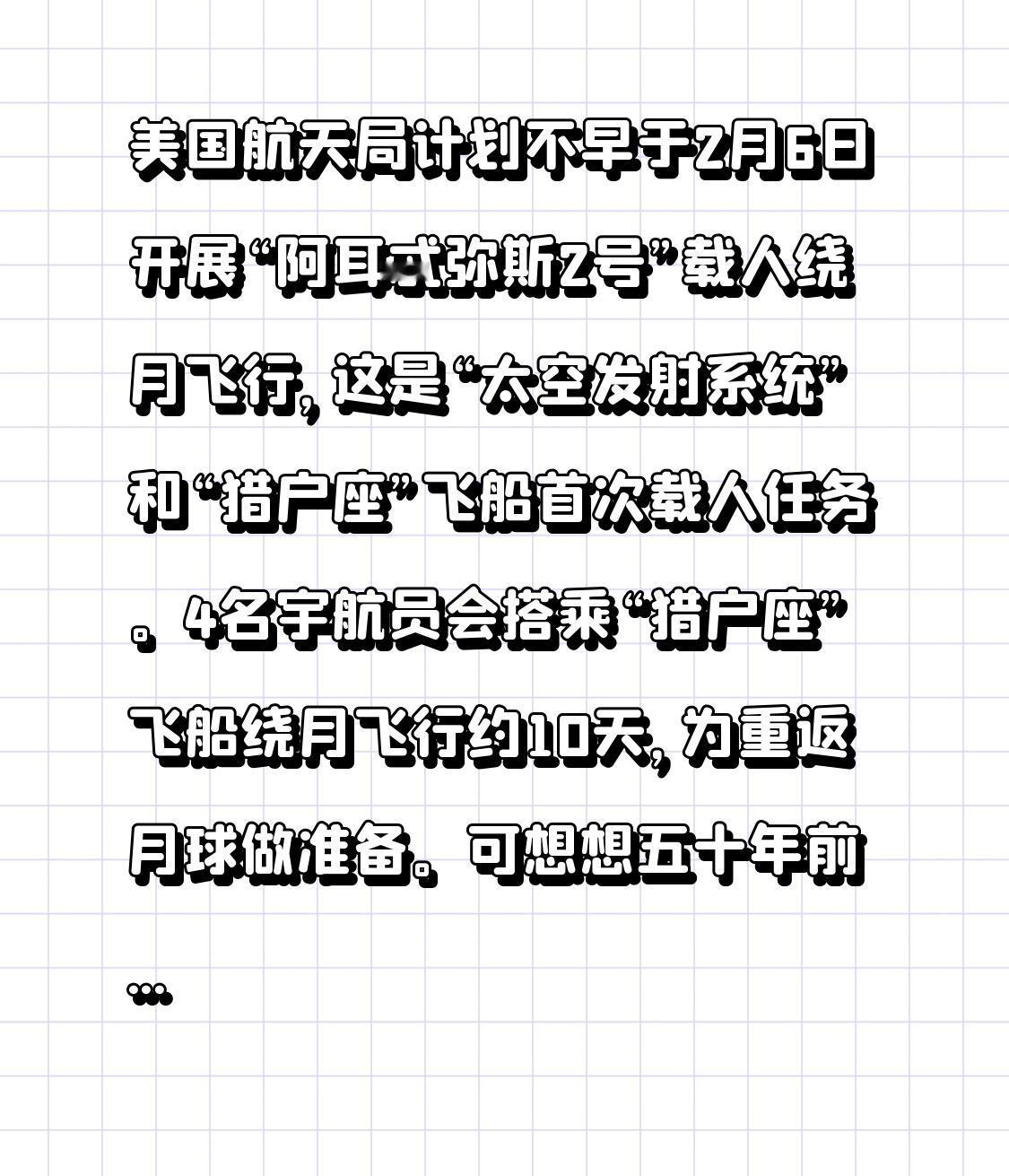 美国航天局计划不早于2月6日开展“阿耳忒弥斯2号”载人绕月飞行,这是“太空发射系统”和“猎户座”飞船首次载人任务。4名宇航员会搭乘“猎户座”飞船绕月飞行约10天,为重返月球做准备。 可想想五十年前美国就宣称登月成功,现在却只敢搞绕月飞行,实在让人怀疑当年登月的真实性。感觉他们像是在吃老本,吹牛的本事倒是一直在线。从当年“壮举”到如今的“保守”绕月,这落差有点大啊,难道是科技退步了?