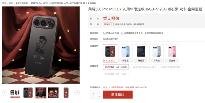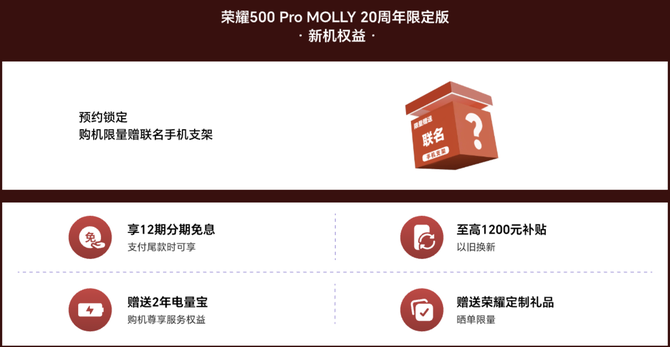 目前,荣耀500ProMOLLY20周年限定版已开放曜石黑16GB+512GB版本预约,购机还可限量获赠联名手机支架,购买即享会员积分,积分可兑换多重权益,且支持满48元免费发货服务。