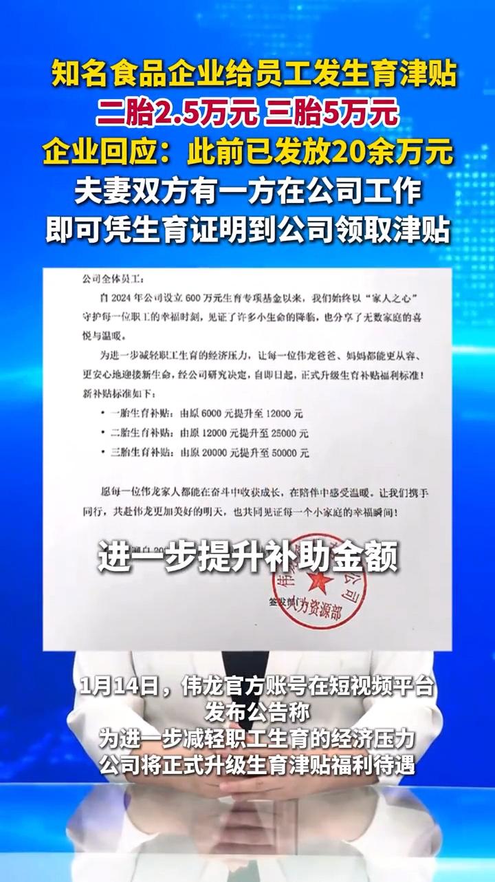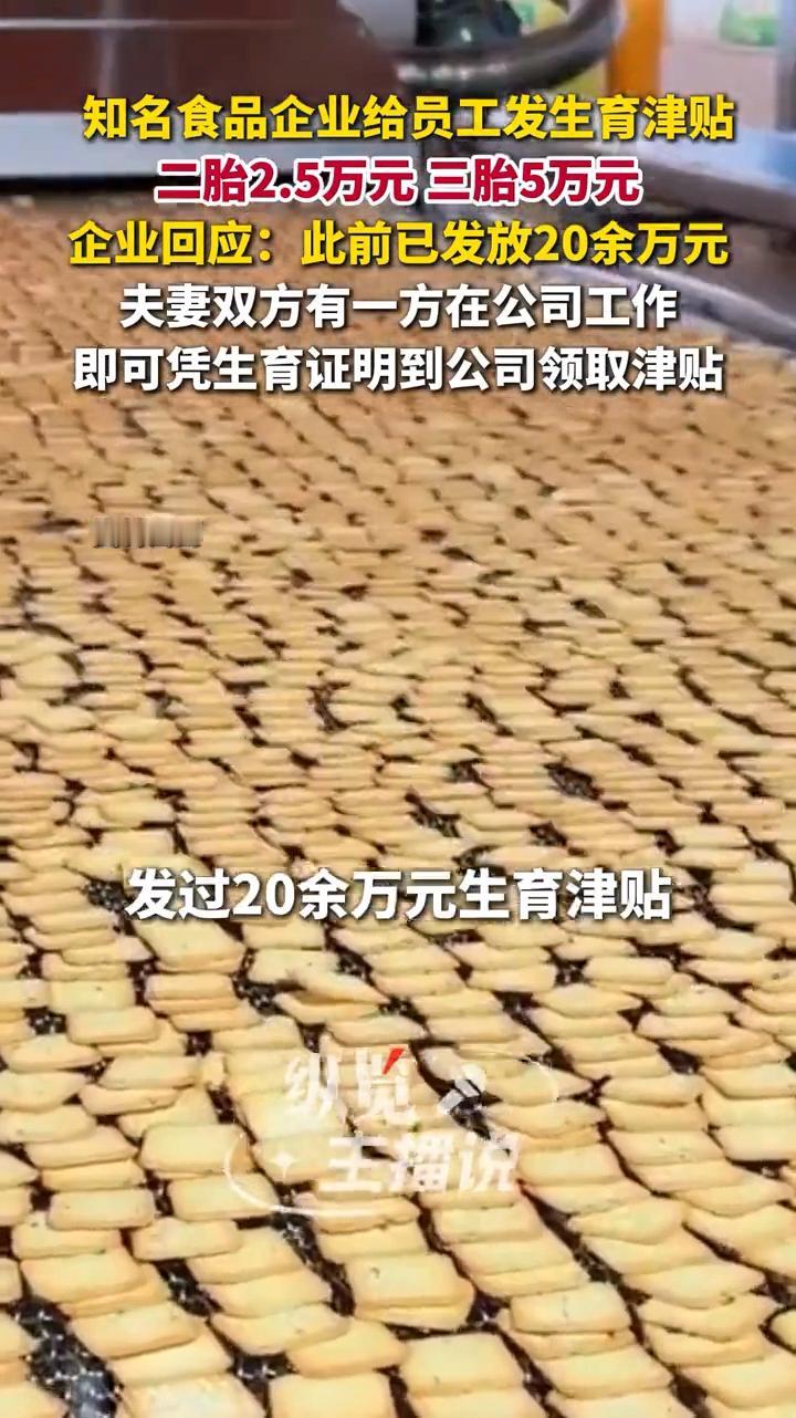 太让人羡慕了!这可是白花花的钞票啊!山东一家饼干企业扔出王炸,直接给三胎员工一次性补贴5万元。不止三胎有钱,二胎一胎也同样有钱拿! 近日,山东的一家生产饼干的食品企业,在网上火了。不是因为它家生产的饼干有多好吃,而是因为它拿出了实实在在的对员工的好福利,让全网都羡慕不已。 原来,这家食品公司为了响应国家的生育政策,将公司此前的生育津贴领取制度进行了全新升级。 生一胎的员工,可以从公司领取的生育津贴由以前6000元,提升至12000元; 生二胎的员工,可以从公司领取的生育津贴由以前12000元,提升至25000元;生三胎的员工,可以从公司领取的生育津贴由以前20000元,提升至50000元。 这次的调整幅度可谓非常大,每一个档次都至少提升了100%。而且,只要是夫妻双方有一方在公司工作,生了小孩后都可以领取,并不是只有女性职工才能领取。 更关键的是,这一项福利政策是公司的单独的政策,与国家的生育津贴并不冲突,也就是说,在这家企业的职工,国家的生育津贴该领就领,额外还可以从公司领取这次津贴。 不得不说,这样的公司真的太温暖了!有一说一,可能就算没有这笔钱,企业员工的生活也不会受到什么影响。但是这笔钱,更多的代表了公司对员工的重视和关心,真真切切地做到了员工第一的原则。 在这样的公司工作,真的太暖心了!