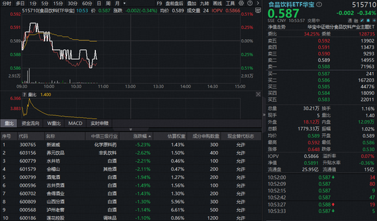 吃喝板块今日(1月15日)继续回调,反映吃喝板块整体走势的食品饮料ETF华宝(515710)开盘短暂拉升后跳水翻绿,截至发稿,场内价格跌0.34%。