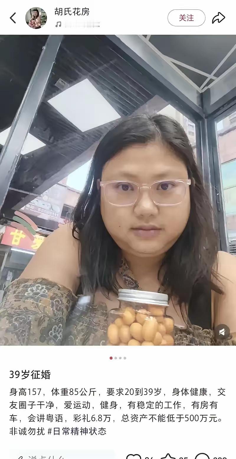 广州一29岁姑娘,在社交平台发征婚帖,写明要500万资产、有房有车、会粤语、体制内优先。 当然,彩礼也是不能少的,6.8万。 真的是心有多高,梦就有多大。 网友看见她随征婚帖附的两张素颜照,劝她还是把征婚条件放低一些吧。要不然,还是好梦一场空。 按说,都29了,已经过了做梦的年纪了,怎么就不能现实一点?