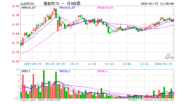 1月15日,截止午间收盘,智能车ETF泰康(159720)涨1.27%,报0.876元,成交额164.09万元。智能车ETF泰康(159720)重仓股方面,宁德时代截止午盘涨0.01%,比亚迪跌0.32%,立讯精密涨2.37%,汇川技术涨2.53%,亿纬锂能涨0.91%,豪威集团跌1.06%,三花智控跌0.40%,长城汽车跌0.14%,拓普集团涨0.21%,科大讯飞涨1.52%。