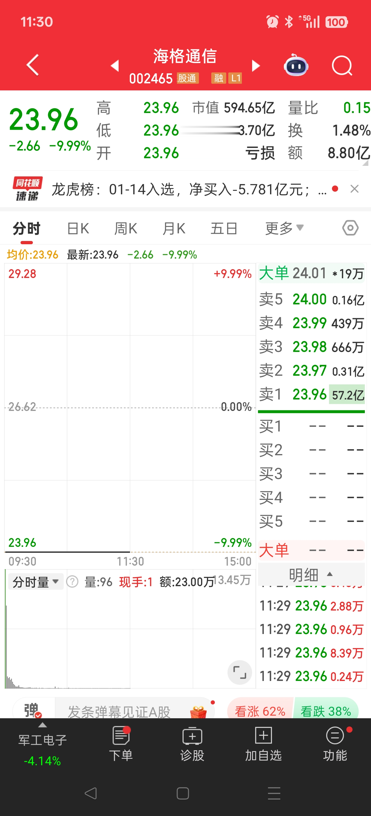 其中,三连板后大单一字跌停的海格通信格外引人关注。1月12日—14日,海格通信连砍三个涨停,市场交投情绪十分活跃。其中,1月14日,海格通信成交额高达170亿元,换手率超25%。1月15日,海格通信一字跌停,压单一度超300万手,金额高达70亿元。截至中午收盘,海格通信仅成交不到9亿元,而压单仍然超57亿元,170亿资金全部“套牢”。