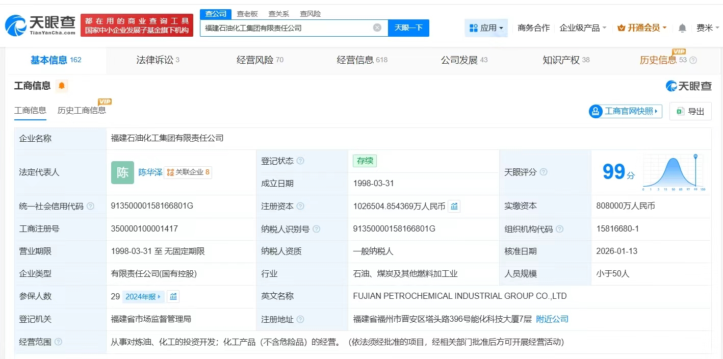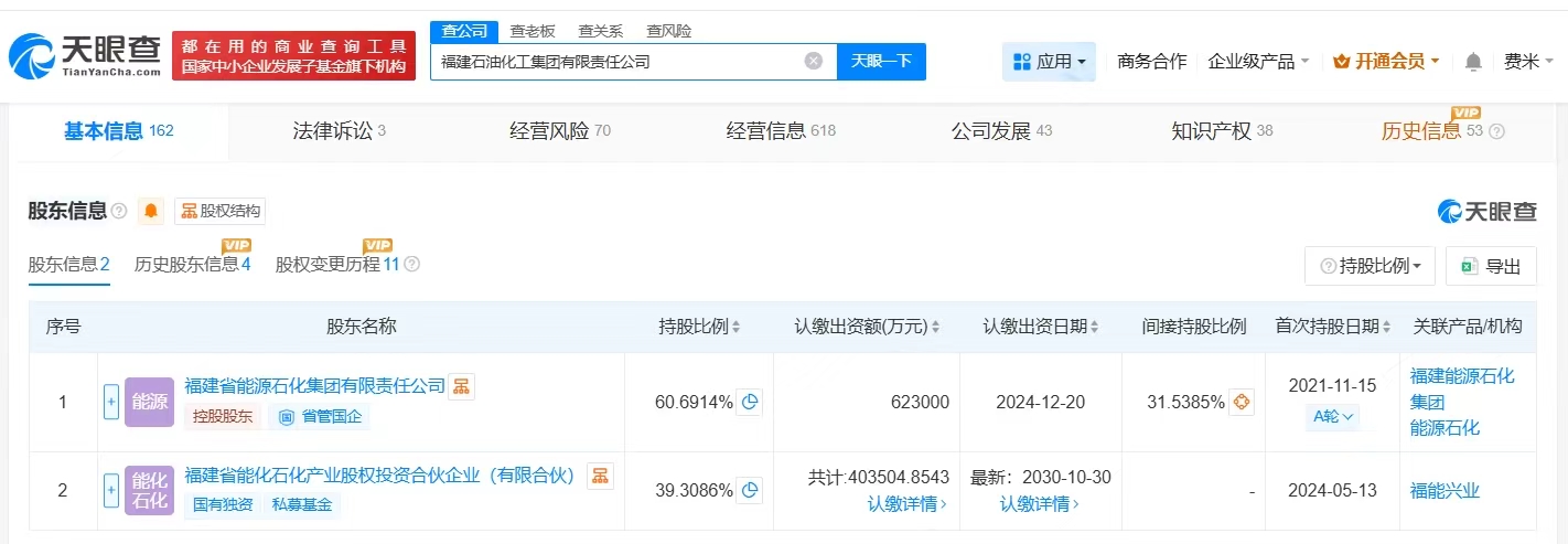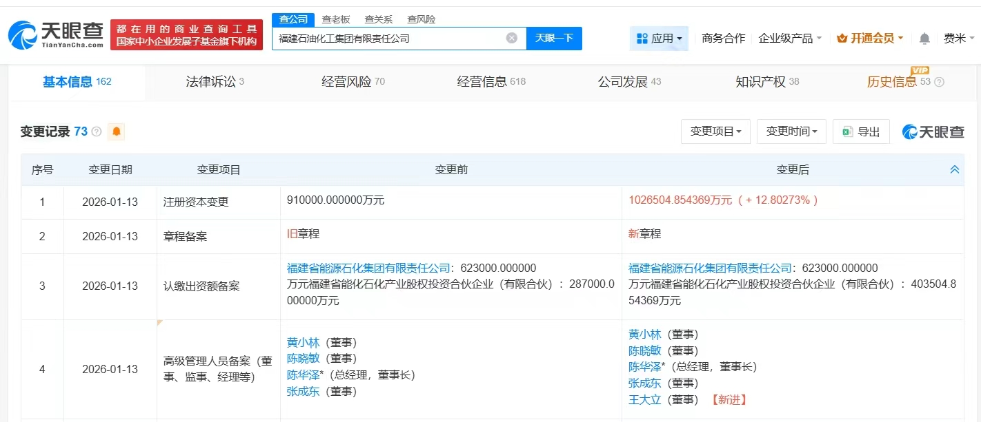 天眼查工商信息显示,近日,福建石油化工集团有限责任公司发生工商变更,注册资本由91亿人民币增至约102.65亿人民币,增幅约13%,同时部分主要人员发生变更。