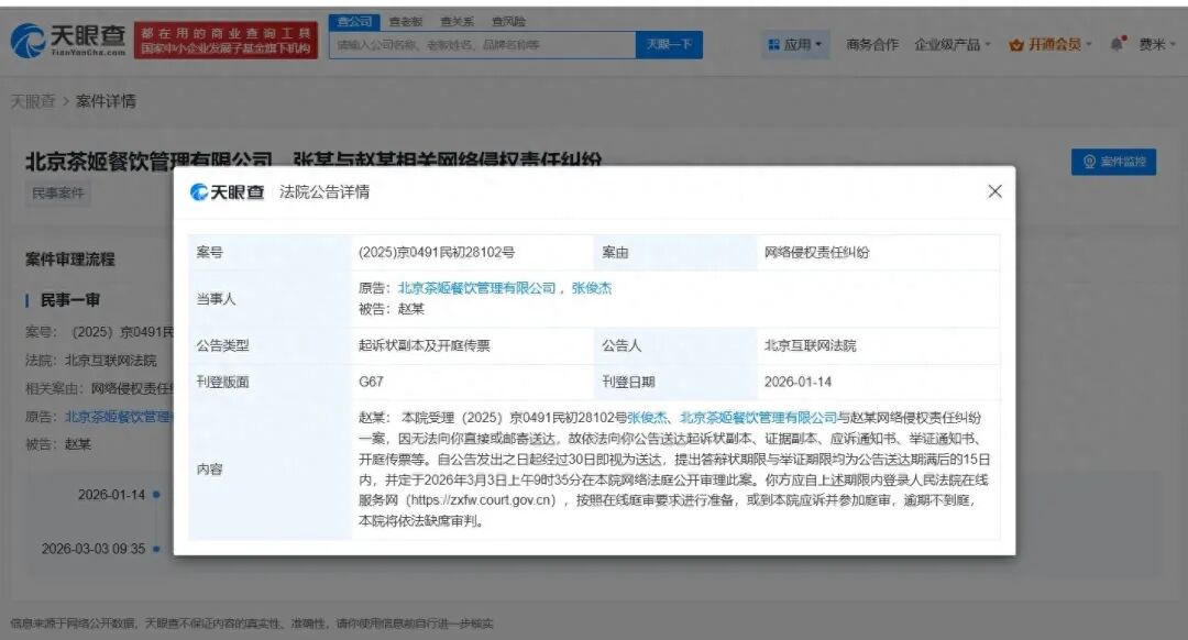 1月15日,九派新闻从天眼查了解到,近日,北京互联网法院向赵某公告送达原告霸王茶姬关联公司北京茶姬餐饮管理有限公司、创始人张俊杰与其网络侵权责任纠纷案件起诉状副本、开庭传票等,自公告发出之日起经过30日即视为送达,该案将定于3月3日开庭审理。