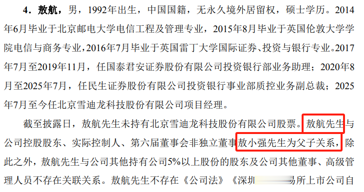 到2025年7月,敖航离开金融圈,加入北京雪迪龙科技股份有限公司担任项目经理,这家公司正是敖航的父亲敖小强创立的企业,老爷子手握着上市公司57%的股份,是绝对的掌门人。