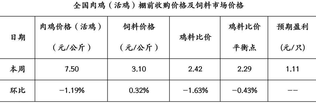 本周全国鸡料比价为2.42,环比下跌1.63%。按目前价格及成本推算,未来肉鸡养殖预期盈利1.11元/只。