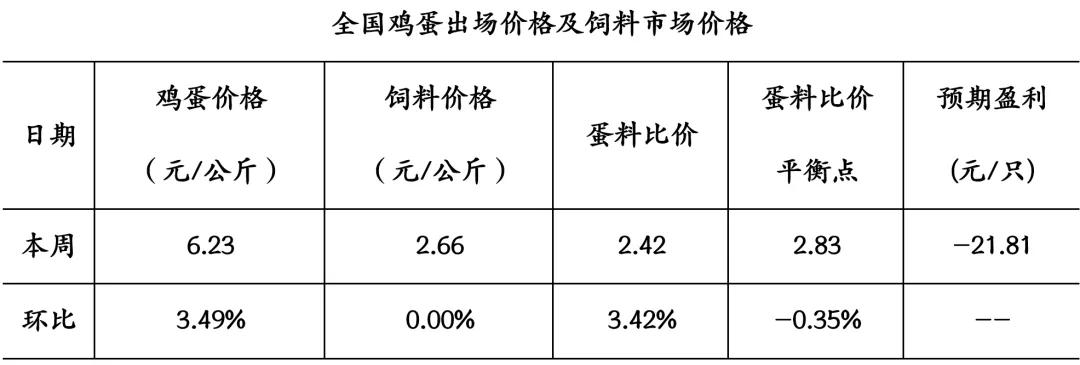 本周全国蛋料比价为2.42,环比上涨3.42%。按目前价格及成本推算,未来蛋鸡养殖每只亏损21.81元。