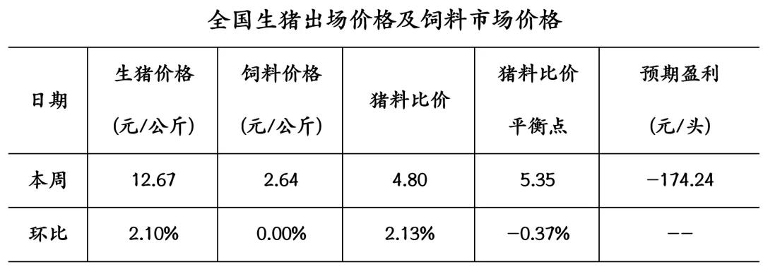 本周全国猪料比价为4.80,环比上涨2.13%。按目前价格及成本推算,未来仔猪育肥模式的生猪养殖头均亏损174.24元。