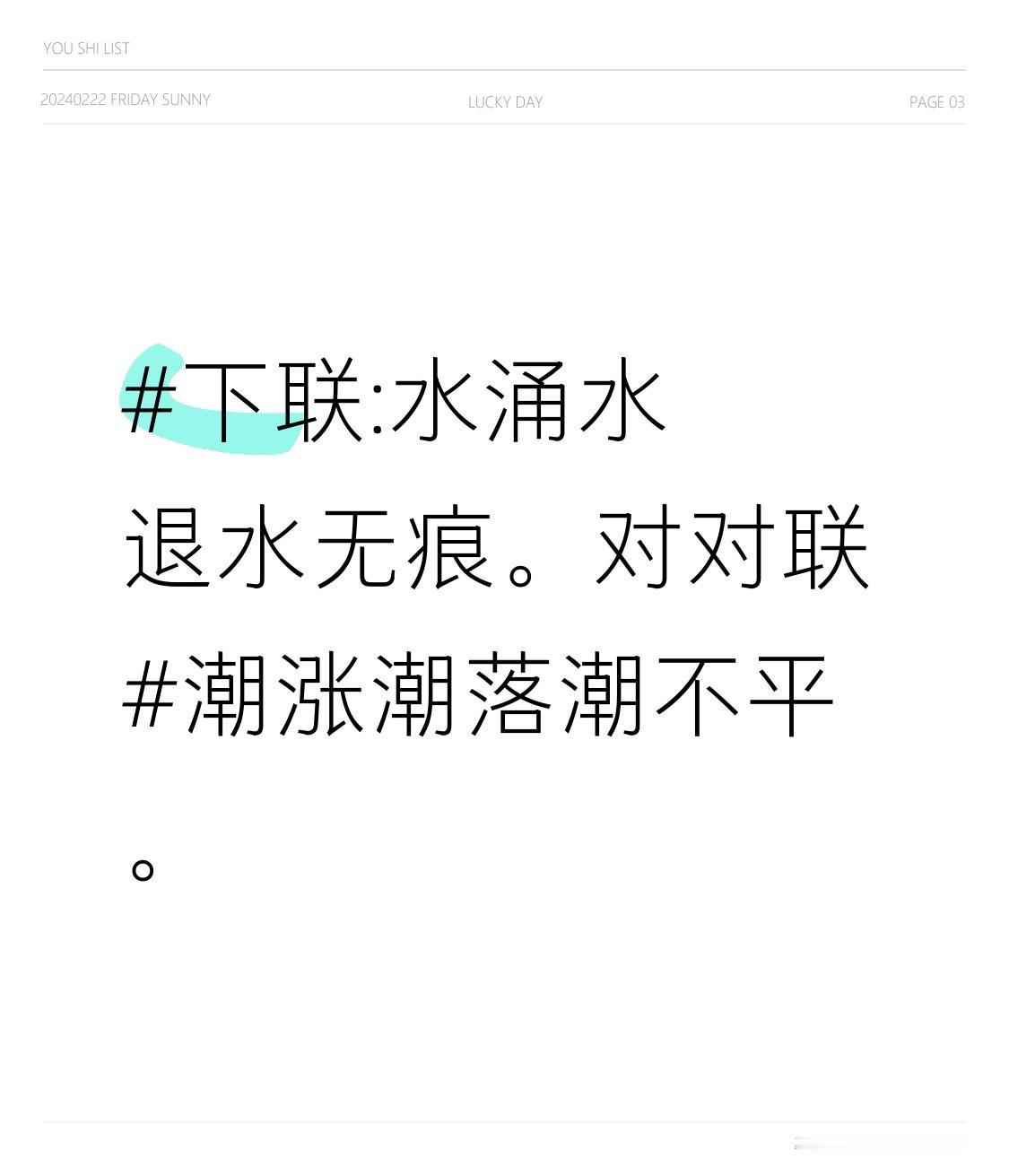 下联:水涌水退水无痕。对对联潮涨潮落潮不平。
