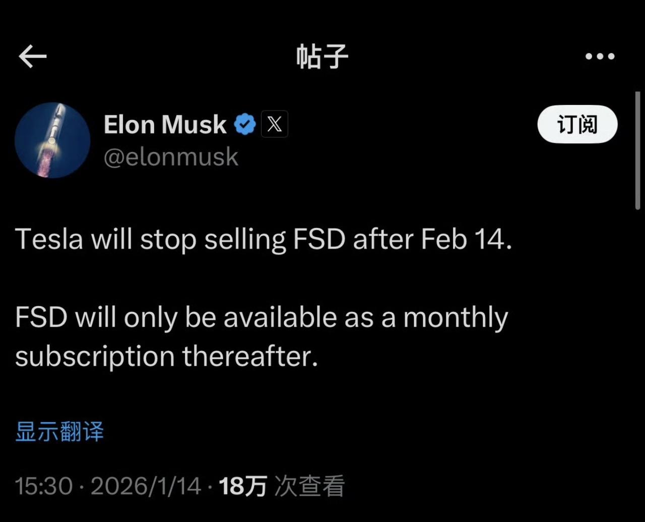 马斯克宣布 2 月 14 全球停售 FSD ! 马斯克宣布自2月14日起全球停售FSD并采用订阅制,这操作挺让人意外的。 FSD一直是特斯拉自动驾驶的王牌,之前很多车主是直接买断。现在改成订阅制,就像从买游戏光盘变成按月充会员。 对于消费者来说,短期成本可能降低了,不用一下子掏出大笔钱。但长期来看,费用可能会更高。而且要是哪天不订阅了,这功能就没了。 从特斯拉角度,这或许能增加现金流,还能持续从老车主那赚钱。不知道这一改变,会让多少人继续为FSD买单呢。