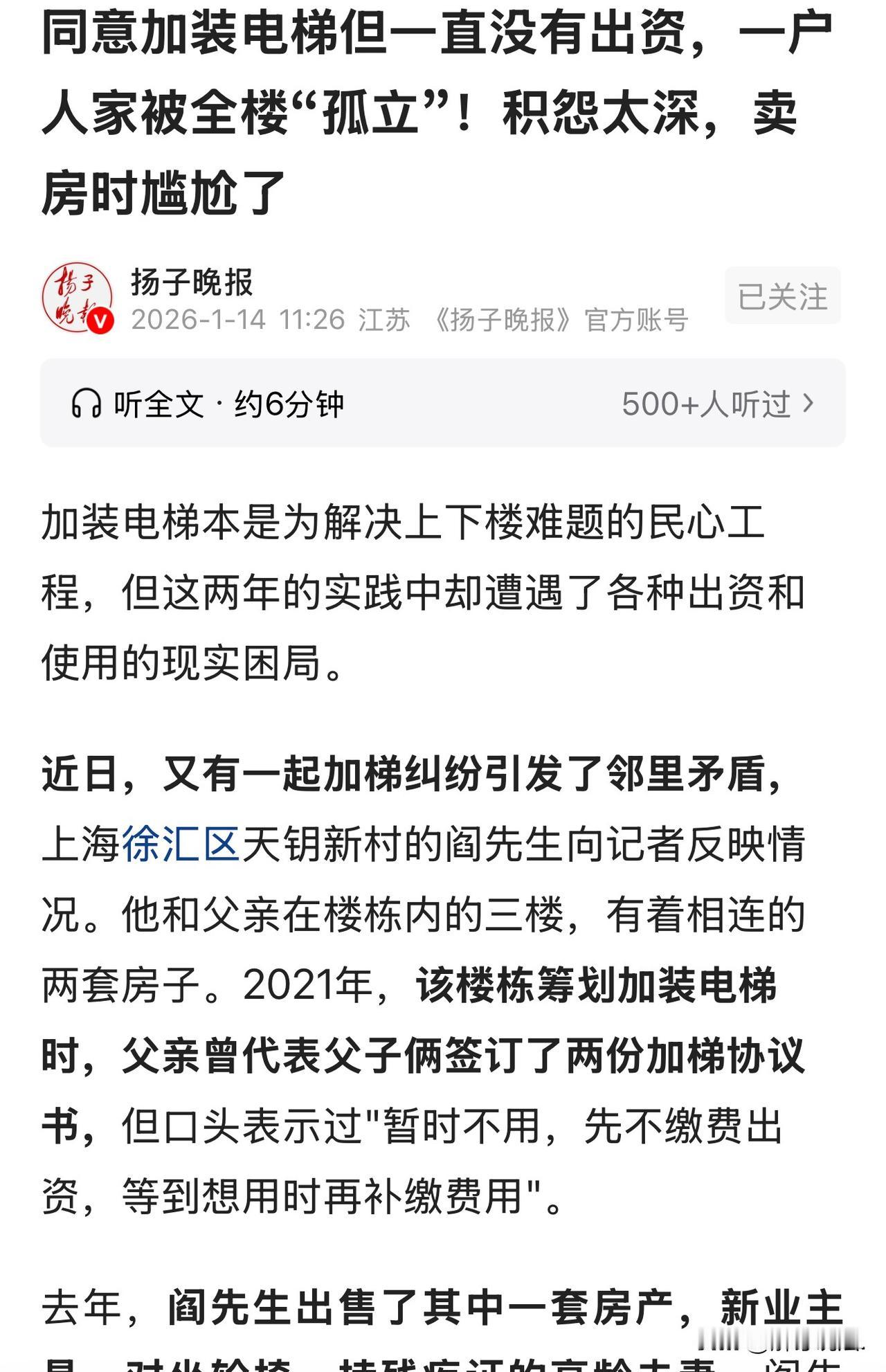 “早知今日何必当初!”上海,男子和父亲所住居民楼加装电梯,男子父亲在《加梯协议书》上签了字,却未缴费,导致电梯安装好后,业主们迟迟不能使用。无奈之下,17户业主分摊了男子和其父亲的费用。随后,男子将楼卖给了一对老年夫妻,老爷子80岁了,身患残疾,出入坐轮椅。男子承诺会补缴5万元费用,让两位老人正常使用电梯,没想到,17户业主不干了:早干啥去了,想用没门儿。 阎先生和父亲居住在徐汇区天钥新村的一栋旧居民楼里,这栋楼是一梯四户的格局,父子俩在三楼拥有两套相互连通的房子。 2021年,有部门开始筹划加装电梯,一楼是商铺,不用参与,所以征询的是2楼到6楼的业主。 加装电梯本来就是为了解决老楼居民上下楼难的问题,尤其是高层的老人,天天爬楼梯实在遭罪,大家大多都挺支持的。 阎先生的父亲当时代表父子俩,签了两份加梯协议书,按说签了字就该按规矩来,可阎先生的父亲当时却说了,“暂时不用电梯,先不缴费出资,等以后想用时再补缴”。 加梯的事儿继续推进,其他业主都按协议交了钱,唯独阎先生家这两套房子的费用一直没动静。 电梯施工、安装,一步步推进,直到2023年7月终于竣工了,可麻烦也来了,因为阎先生家没交的这笔钱,工程尾款一直拖着没结清,其他业主也不愿意额外分摊这笔钱,结果就是崭新的电梯装好了,却没法用,就那么杵在那儿,成了个摆设。 这一拖可就是大半年,从2023年7月到2024年5月,整整快十个月的时间,楼里的老人们可受了罪。 有居民说,那段时间自己要去医院开刀,脚不能走路,本来盼着电梯能用,结果一等就是5个月,邻居们对此怨声载道。 原本还算和睦的关系,因为这电梯的事儿彻底闹僵了,心结也就这么结下了。 直到2024年5月,在居委会的协调下,17户已经出资的业主没办法,只能自己又分摊了这笔尾款,电梯这才终于投入使用。 但这时候,大家心里的气还没消,17户业主一起签了一份决议书,上面写得明明白白:阎先生家要想使用电梯,必须得到每一户人家的同意,只要有一户不同意,就不能用电梯。 这“一票否决”的规矩,当时就为后来的事儿埋下了伏笔。 转折点发生在去年,阎先生打算把其中一套房子卖掉。 买房子的是一对高龄夫妻,老爷子80岁了,还坐着轮椅,俩人手头都有残疾证,行动特别不便。 阎先生卖房的时候跟这对老夫妻承诺了,会跟邻居们协商好,让他们能用上电梯。 毕竟人家坐轮椅,没电梯上下楼根本不现实。 这时候阎先生也想通了,邻里关系还是重要,不想再闹矛盾,于是决定把已经卖掉的那套房子,还有他父亲现在住着的这套房子的加梯费用一起补缴了,总共5万多块钱,他愿意全额承担。 可让阎先生没想到的是,当他找到加梯小组和居委会,说想补缴费用的时候,大多数邻居都不同意。 不过也有几位业主觉得,阎先生现在愿意补缴是好事,接受补缴其实是更理性的选择。 但架不住多数邻居态度坚决,毕竟当初因为这笔钱,大家多花了钱不算,还受了大半年的罪,心里的怨气没那么容易消散。 现在最着急的还是新业主那对老夫妻,年纪大了还坐轮椅,没电梯根本没法正常生活。 居委会一直在努力帮着协调解决,但因为之前的积怨太深,协调起来异常艰难。 《民法典》第271条规定:业主对建筑物内的住宅、经营性用房等专有部分享有所有权,对专有部分以外的共有部分享有共有和共同管理的权利。 加装电梯属于楼栋业主共有设施,阎先生父子及新业主作为房屋所有权人,依法享有对电梯的共有和共同管理权利,该权利不因未及时出资而被剥夺。 但前提是阎先生家需补缴全部应承担的加梯费用及邻居垫付的尾款。 另外阎先生应额外支付一笔电梯维保补偿款,既能弥补邻居此前的损失、展现和解诚意,化解矛盾,早日让两位老人顺利使用上电梯。