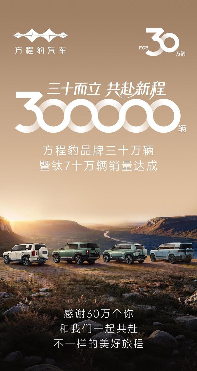IT之家1月15日消息,今天上午,比亚迪方程豹汽车宣布,方程豹品牌30万辆销量、钛7车型10万辆销量现已达成,并取得“新势力品牌增速第一”的成就。