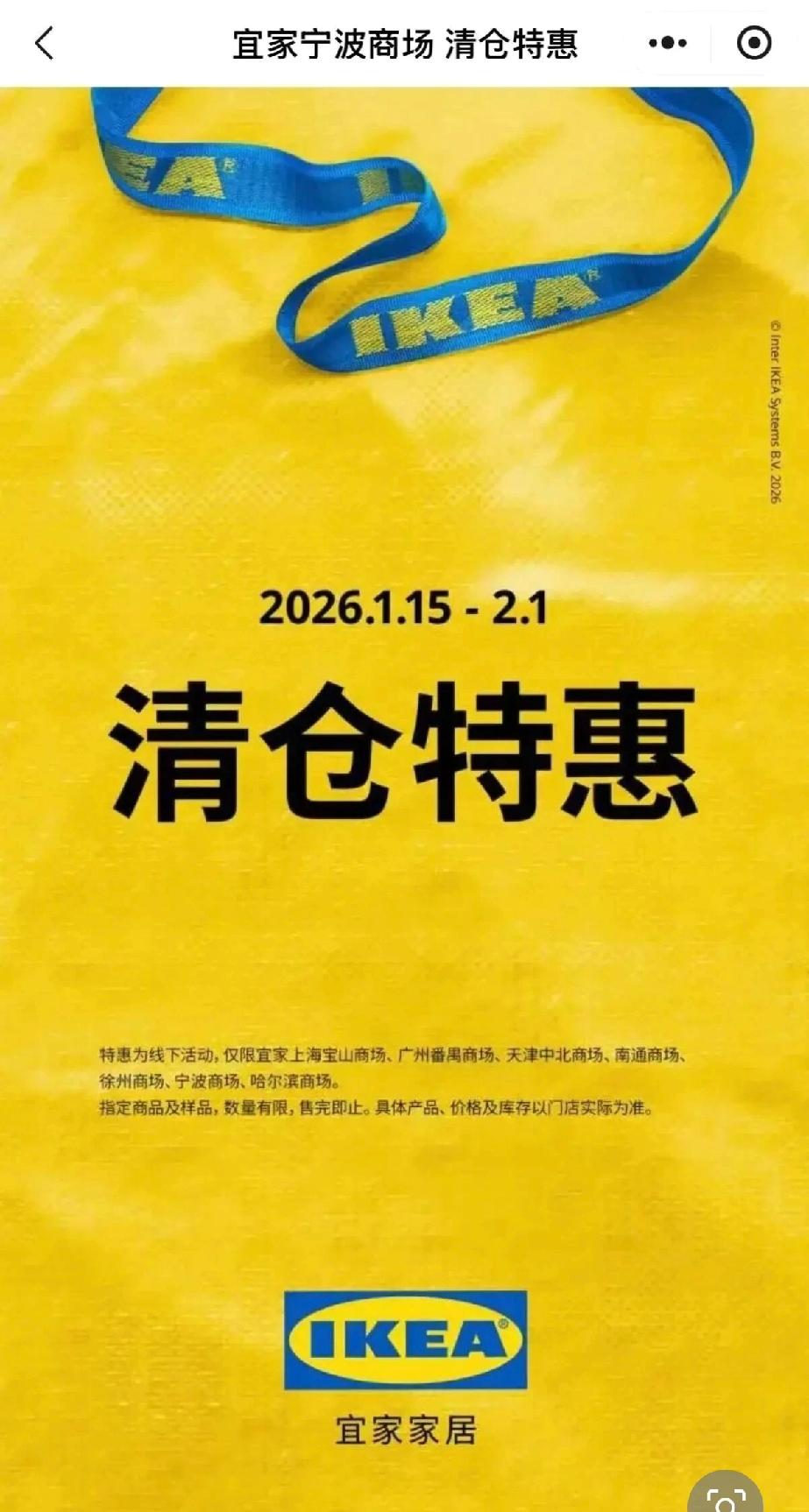 宁波宜家今日起开始闭店前折扣大甩卖,冲不冲? 宁波宜家今天起到2月1号,清仓处理大部分商品,有500款商品对折起优惠,太诱人了,正好我也想买几个凳子。 可看到朋友圈发的今天上午宜家里都是去捡漏的人,到处排队,我就打退堂鼓了。 有朋友明天要去凑下热闹,我让她帮我看看打折的圆凳子,如果有,帮我抢六把,其他的现场发视频商量。 你说,这么多人去消费,会不会把宜家给救活了,重新开业了?
