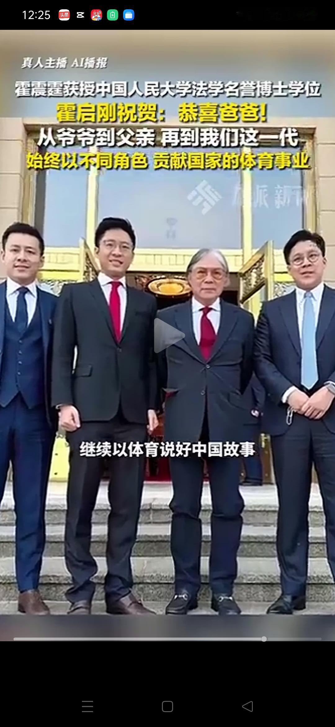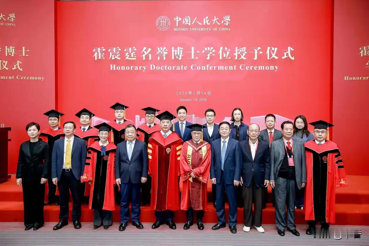 为什么不是北大、清华,而是中国人民大学? 79岁的霍震霆,穿着一身大红色博士服,头戴学位帽,精神抖擞的站在台上,手里接过中国人民大学法学名誉博士学位证书的时候,我们都为霍家高兴!爱国者,祖国不会忘记! 中国人民大学能有这个行动,让人佩服!为什么不是北大、清华呢?我们希望中国的一流大学,都要反思,都是考虑,怎么能为祖国强大而做出应有的贡献。 香港霍震霆 霍震霆全家