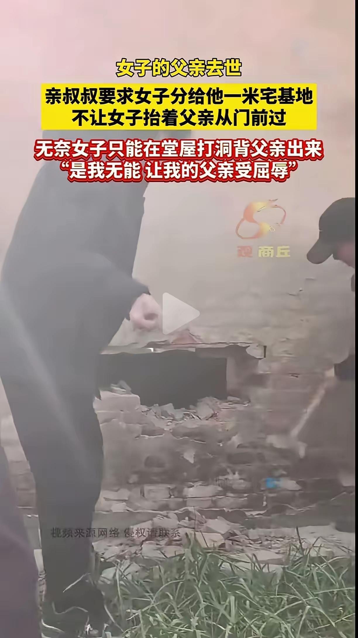这位叔叔怕是没想到侄女会来这一手。 父亲刚走,叔叔堵在出殡的必经路上,说要一米宅基地。不给地,棺材就不能过。 侄女求他先让父亲入土为安,叔叔不松口。村干部来劝,他叫两个儿子把路彻底堵死。 侄女转身找人砸了堂屋后墙,从洞口把父亲背出去。邻居搭了把手,没人搭理叔叔。 一块砖宽的地,换一场丧事的体面。老人常说血脉连筋,现在看,筋断在算计里。