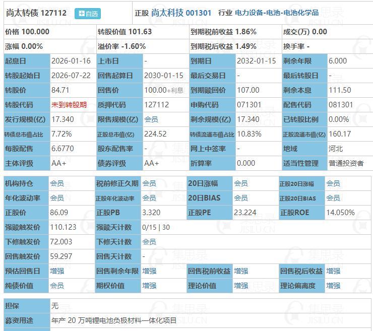1月16日尚太转债、耐普砖02申购。根据当前市场情绪及可转债交易行情: 尚太转债上市时预计会有47%的溢价,预估上市价值为150元。尚太转债为AA+级转债,转股价值较高,纯债价值较低。正股盈利能力较好,盈利预期较好,我会顶额申购。 耐普转02上市时预计会有32%的溢价,预估上市价值为135元。耐普转02为A+级转债,转股价值较高,纯债价值较低。正股盈利能力尚可,规模较小,有一定的炒作预期。耐普转02盈利预期较好,我会顶额申购。
