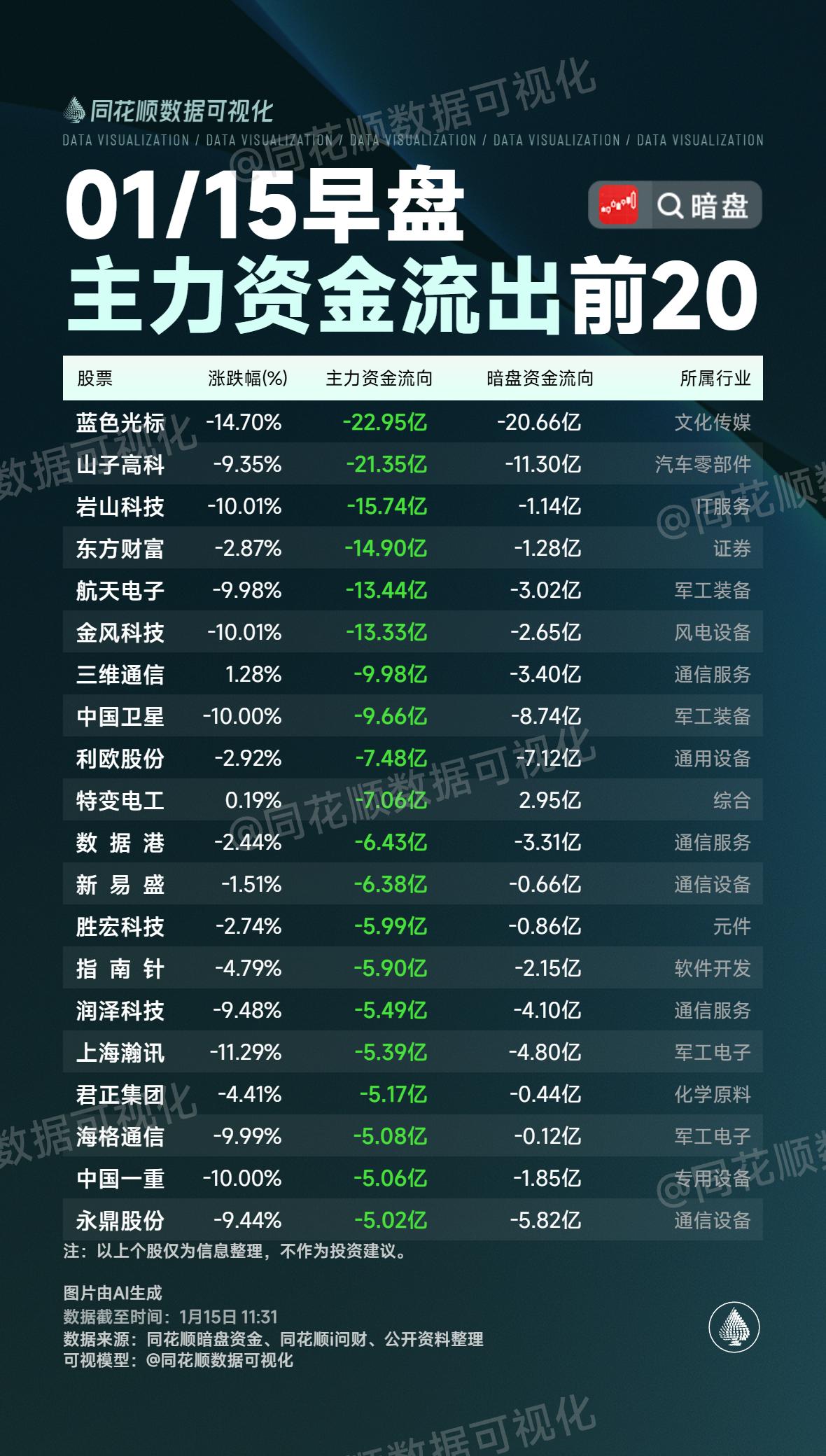 1月15日,周四A股午盘主力暗盘资金流入流出一览表!!! 沃尔核材主力资金大幅流入15.29亿,暗盘主力资金大幅流入5.65亿,后市值得高看一眼;航天机电主力资金流入9.01亿,暗盘资金流入2.04亿,后市值得期待;蓝色光标主力资金大幅流出22.95亿,暗盘主力资金大幅流出20.66亿,后市需小心谨慎操作!!!
