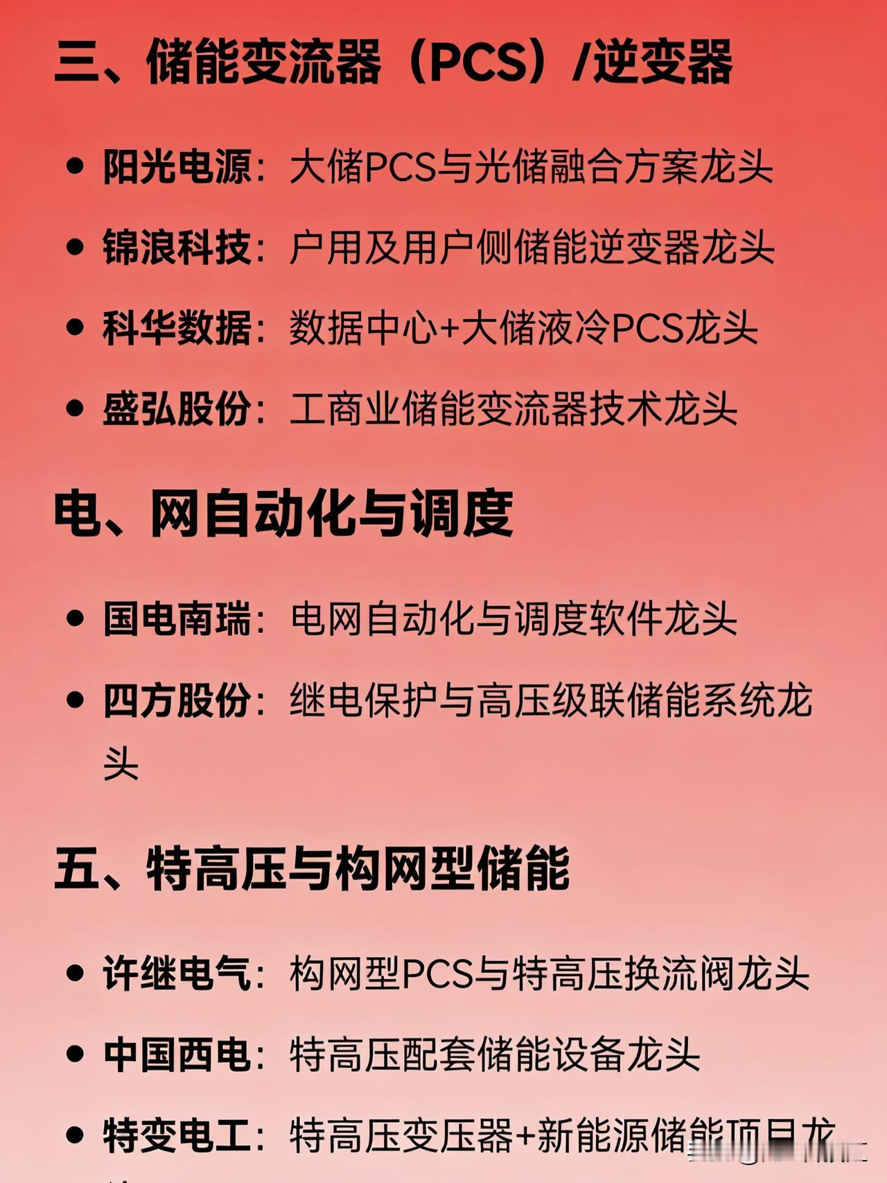 储能+智能电网概念细分龙头企业汇总 一、储能系统集成 阳光电源:全球储能系统集成龙头 比亚迪:电网级储能系统龙头 阿特斯:光储一体化项目龙头 二、储能电芯(电池) 宁德时代:全球储能电芯出货量龙头 亿纬锂能:大容量储能电芯主要供应商 三、储能变流器(PCS)/逆变器 阳光电源:大储PCS与光储融合方案龙头 锦浪科技:户用及用户侧储能逆变器龙头 科华数据:数据中心+大储液冷PCS龙头 盛弘股份:工商业储能变流器技术龙头 四、电网自动化与调度 国电南瑞:电网自动化与调度软件龙头 四方股份:继电保护与高压级联储能系统龙头 五、特高压与构网型储能 许继电气:构网型PCS与特高压换流阀龙头 中国西电:特高压配套储能设备龙头 特变电工:特高压变压器+新能源储能项目龙头 六、储能温控与热管理 英维克:储能液冷/风冷温控系统龙头 七、新型储能技术路线 上海电气:全钒液流电池系统龙头 华阳股份:钠离子电池储能应用龙头 国机重装:压缩空气储能工程龙头 太原重工:飞轮储能技术龙头 八、虚拟电厂与智能计量 煜邦电力:电能量采集与虚拟电厂计量技术龙头 南网科技:电网侧储能EPC与调频服务龙头 九、智能制造与装备 先导智能:储能产线整线装备龙头 利元亨:智能化储能系统制造装备龙头 十、便携/户用储能 华宝新能:便携式储能产品龙头 派能科技:家用储能电池系统龙头