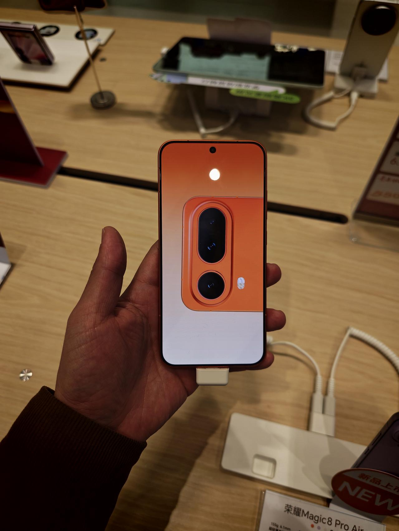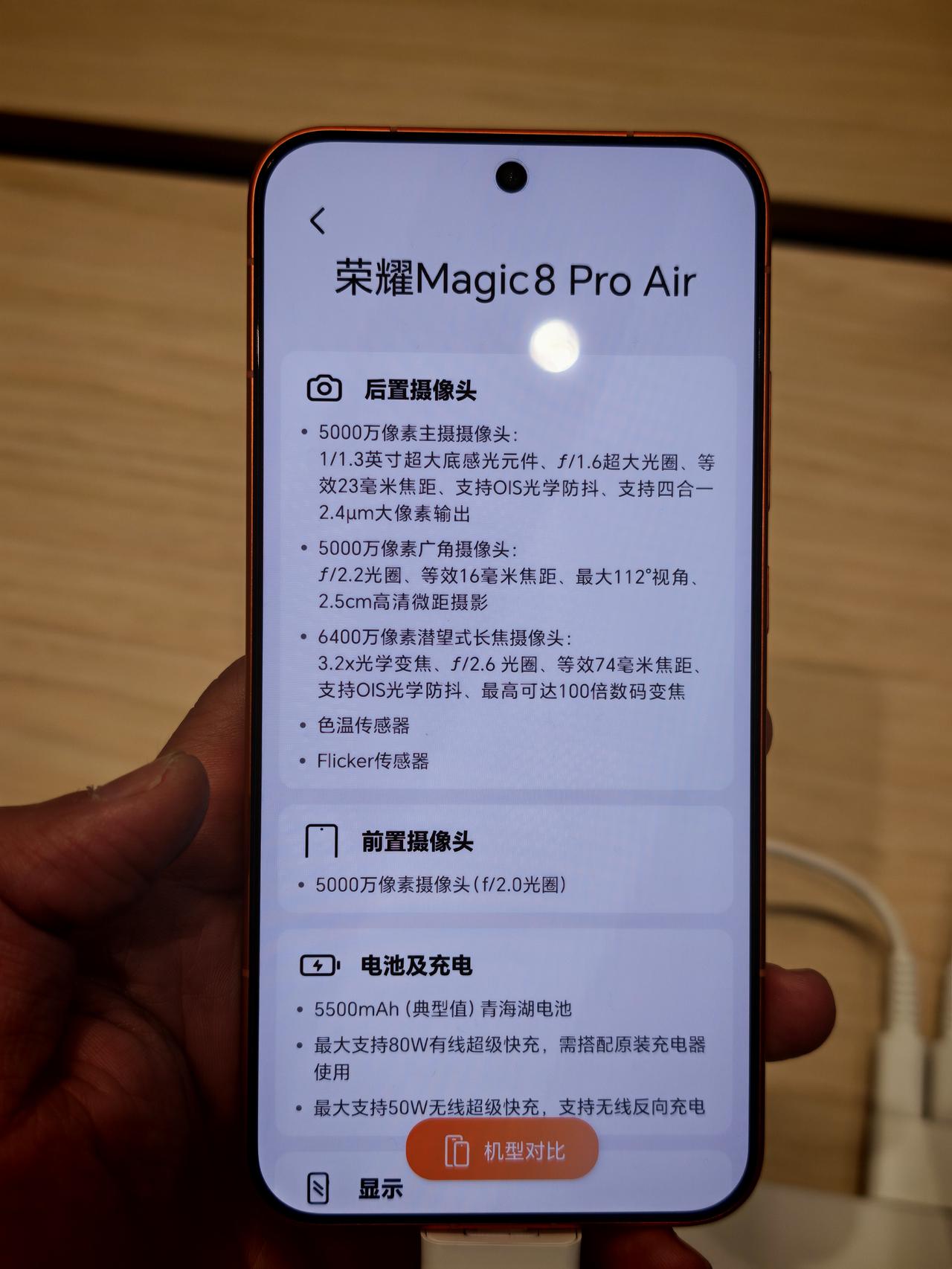 门店有Magic8 Pro Air可以摸了。 配置参数也全都有显示。 确认了,手感真的相当舒服。个人感觉比果Air更舒服。宽度更轻松,直边框拿起来可能感觉没有果Air那么薄。 对比起来Magic8 Pro就不那么轻薄了[捂嘴哭] 紫色很淡雅,橙色很亮,没有摸到白色黑色。 5500mAh电池,80W有线,50W无线,太好了又无线充。 长焦的防抖也是相当稳。 侧边AI键和500 Pro一样是振动反馈的,不是8 Pro这种可以按下去的。 现在就等19号的价格了。