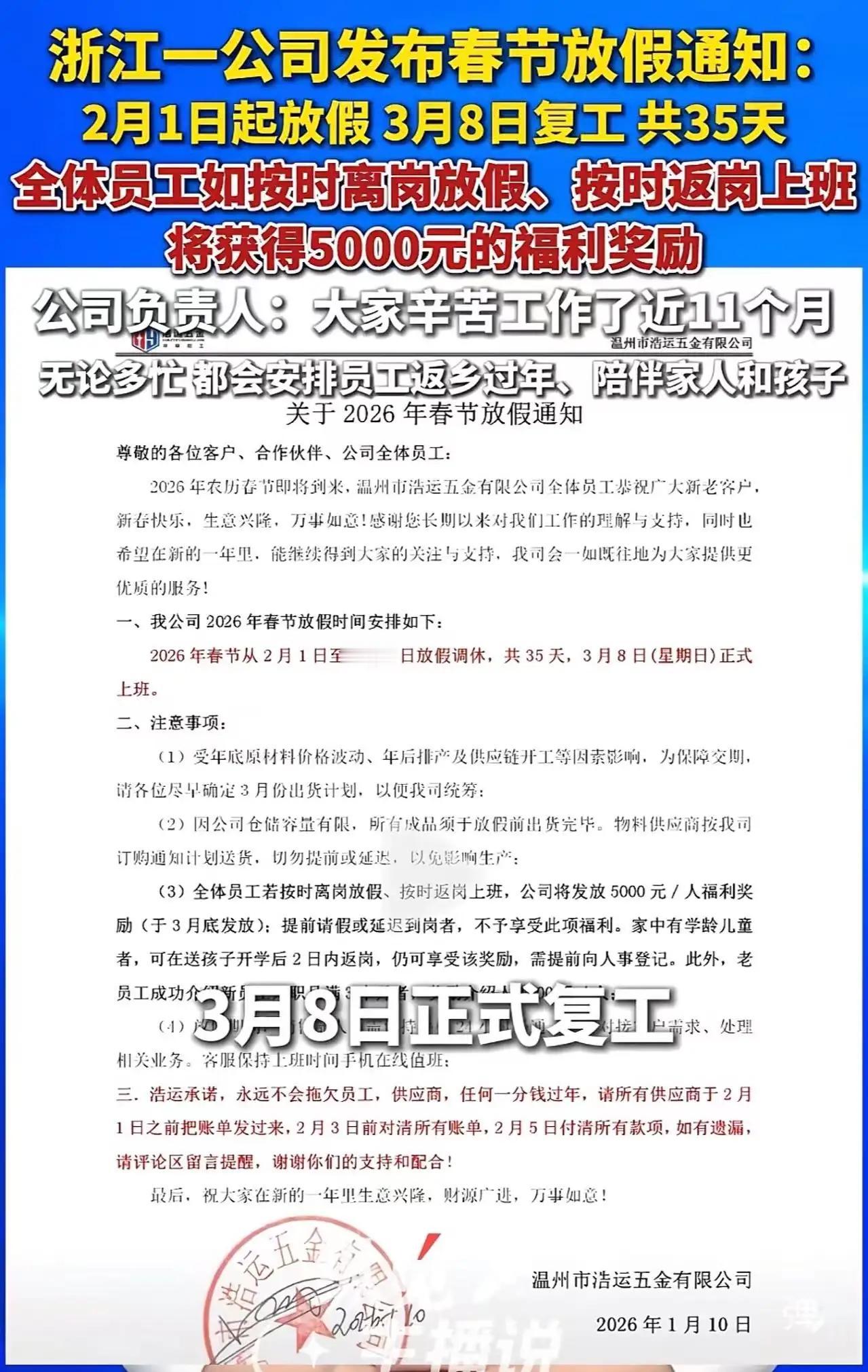怪不得这家公司能发财 !浙江温州,一公司春节放35天!公司负责人:员工按时离岗,
