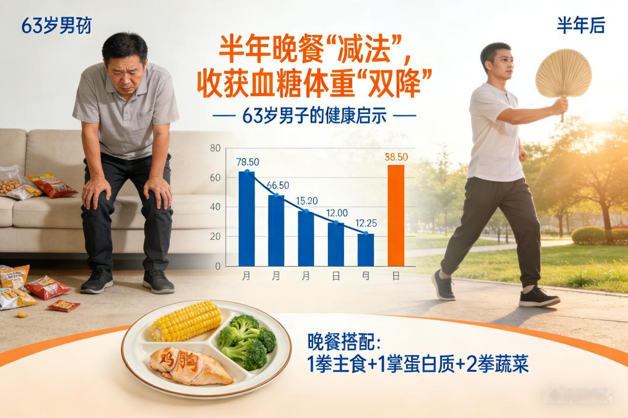 63 岁男子半年不吃晚饭,血糖体重变化惊人 63岁大叔为降糖“过午不食”,半年后体检报告吓傻医生:这是在减寿! 63岁的老陈体检查出“糖尿病前期”,为了拒吃药,他开启了极端“苦行僧模式”:不吃晚饭,饿了就灌水。坚持半年,他确实“瘦了”,从165斤掉到142斤,但上周的复查结果却让医生拍桌怒吼:“简直是拿命赌博!” 减掉的不是肉,是“寿命银行”里的肌肉。 体重秤上的数字虽然好看,但人体成分分析揭开了残酷真相:老陈减掉的23斤里,只有8斤是脂肪,剩下15斤竟是宝贵的骨骼肌!现在的他,走路发飘、提菜手抖,基础代谢率暴跌。肌肉是人体最大的“降糖仓库”,肌肉一旦流失,胰岛素就没了去处,血糖反而更难控。 血糖陷入“死亡反弹”。 最讽刺的是,老陈的空腹血糖不仅没稳住,反而从6.8飙升至7.5,餐后血糖更是冲破12.0。医生指出,这是典型的“苏木杰效应”:长期饥饿导致夜间低血糖,身体误以为闹饥荒,于是在清晨疯狂分泌升糖激素“自救”,导致血糖报复性反弹。 隐形杀手已潜伏。 B超显示,老陈胆囊里竟长了1.2cm的结石——长期不进食导致胆汁淤积。更危险的是,他曾两次夜间出现冷汗、心悸的严重低血糖,若无人发现极可能猝死。 警钟长鸣: 靠“饿”治糖是饮鸩止渴。晚餐不是不能吃,而是要吃“对”——杂豆饭配绿叶菜,既稳糖又保肌。别让无知的养生,变成了害生!
